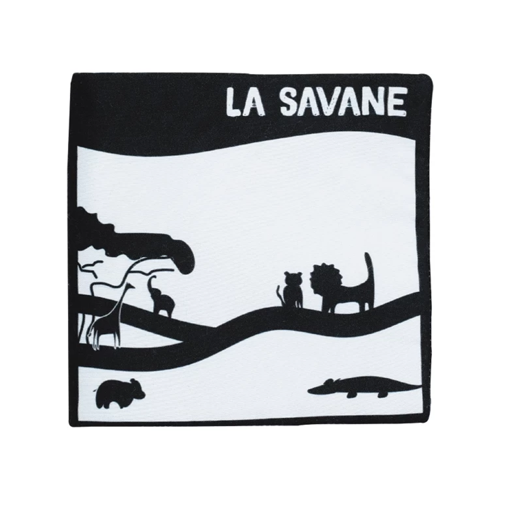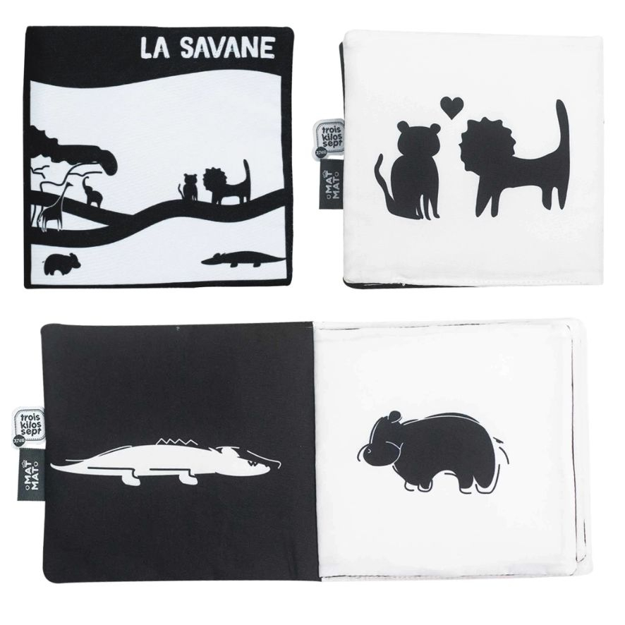 Βιβλίο δραστηριότητας από την εταιρεία Trois Kilos Sept με ζωάκια στο σχέδιο. Είναι υφασμάτινο κατασκευασμένο από 100% πολυεστέρα. Είναι διπλής όψης. Έχει ασπρόμαυρες εικονογραφήσεις με έντονες αντιθέσεις. Το μωρό θα εξερευνήσει τη σαβάνα και θα γνωρίσει τους αξιαγάπητους χαρακτήρες. Την Ιππολύτα τον ιπποπόταμο, τον Φιλ τον κροκόδειλο και τον Λίνο το λιοντάρι. Αυτό το βιβλίο είναι ιδανικό για την τόνωση της όρασης των μωρού. Τα ενθαρρύνει να παραμένουν περισσότερο μπρούμυτα με τις διασκεδαστικές δραστηριότητες και τον μοναδικό του σχεδιασμό. Προσφέρει πλούσια αισθητηριακή διέγερση στα μικρά μωρά. Ιδανικό για αφήγηση ιστοριών και ανάπτυξη γλώσσας. Εύκολο να διπλωθεί ώστε να το πάρετε παντού. Κατάλληλο από την πρώτη μέρα γέννησης. Συνδυάστε το με τα υπόλοιπα είδη της σειράς για ένα ολοκληρωμένο αποτέλεσμα.