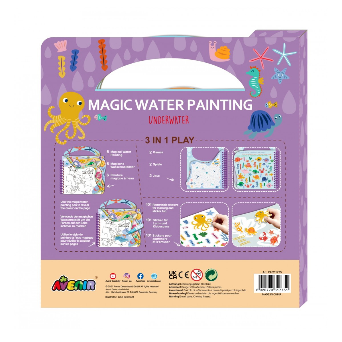 Βιβλίο ζωγραφικής με μαρκαδόρο νερού από την εταιρία Avenir. Αποτελεί ένα πρακτικό βιβλίο ζωγραφικής με λαβές για να μεταφέρεται εύκολα. Μπορεί το μικρό σας να ζωγραφίζει τις εικόνες επανειλημμένα, απλώς βρέχοντας το πινέλο με λίγο νερό. Μόλις στεγνώσει το φύλλο ζωγραφικής, το χρώμα εξαφανίζεται για να μπορεί το μικρό σας να ζωγραφίσει ξανά από την αρχή. Οι επιπλέον γρίφοι που βρίσκονται στο βιβλίο, θα κρατήσουν το ενδιαφέρον του μικρού σας αμείωτο. Κατάλληλο για ηλικίες 3+ ετών.