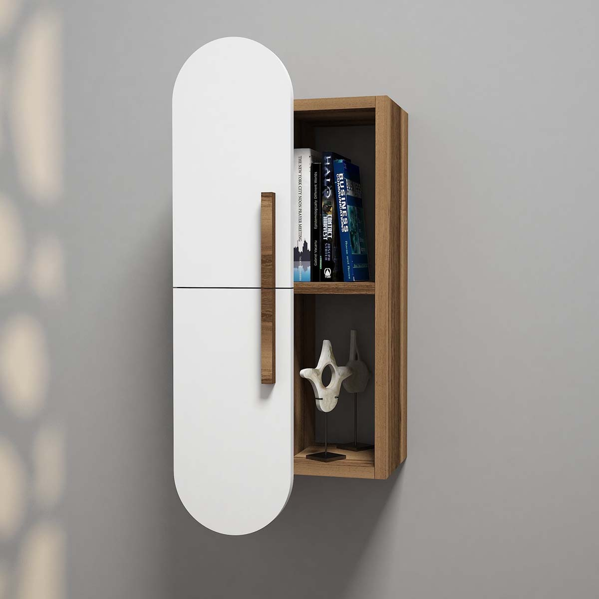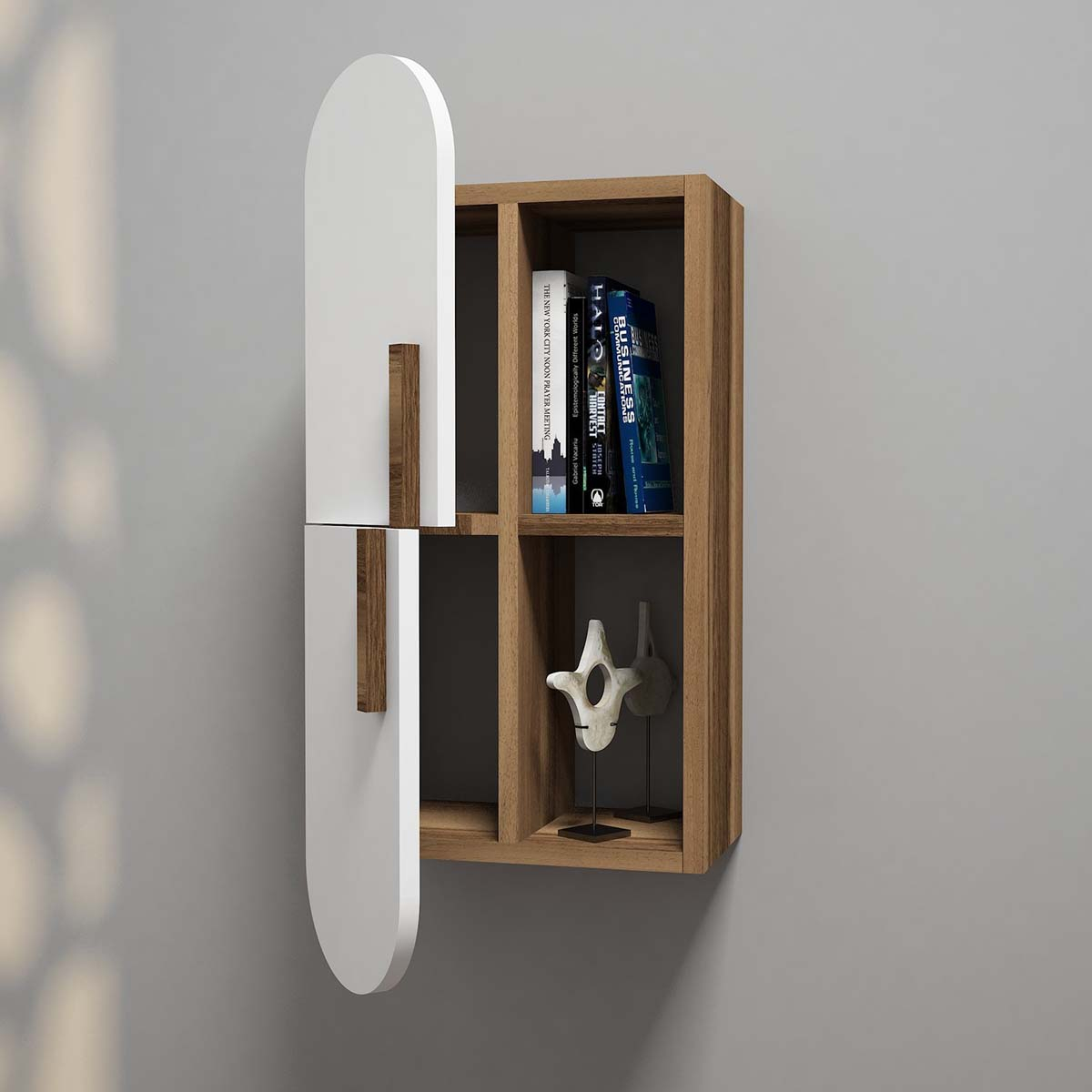 Βιβλιοθήκη τοίχου σε φυσική απόχρωση ξύλου και λευκές λεπτομέρειες. Διαθέτει ντουλάπια με ράφια εσωτερικά για να τοποθετήσε επιπλέον βιβλία, μικροαντικείμενα κ.α. Κατάλληλη για να διακοσμήσει όλους τους χώρους του σπιτιού ή του γραφείου και να δώσει μοντέρνο ύφος. Το προϊόν έρχεται αμοντάριστο και συναρμολογείται βάσει οδηγιών.