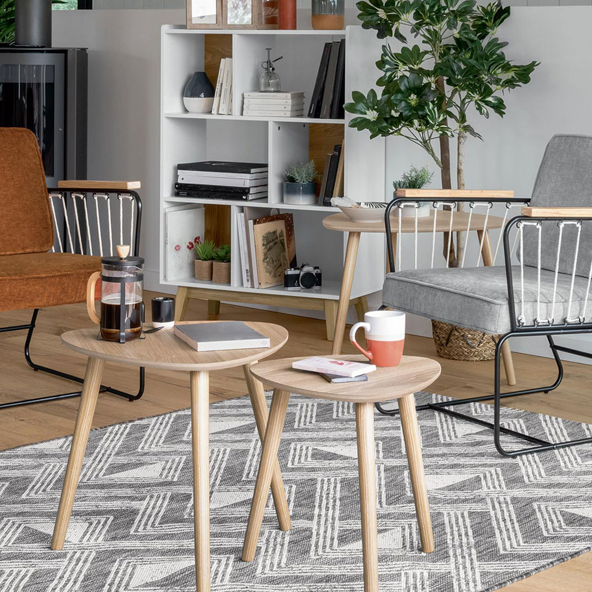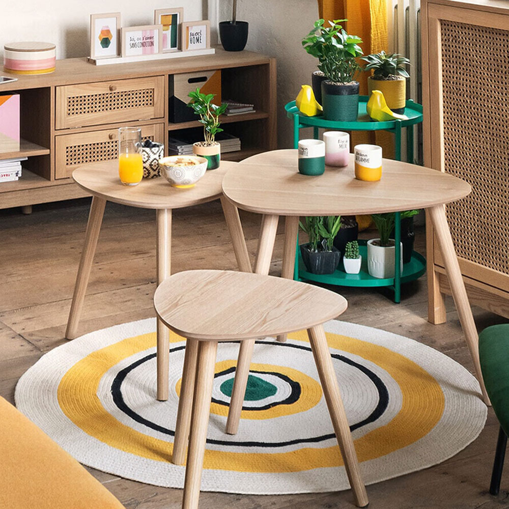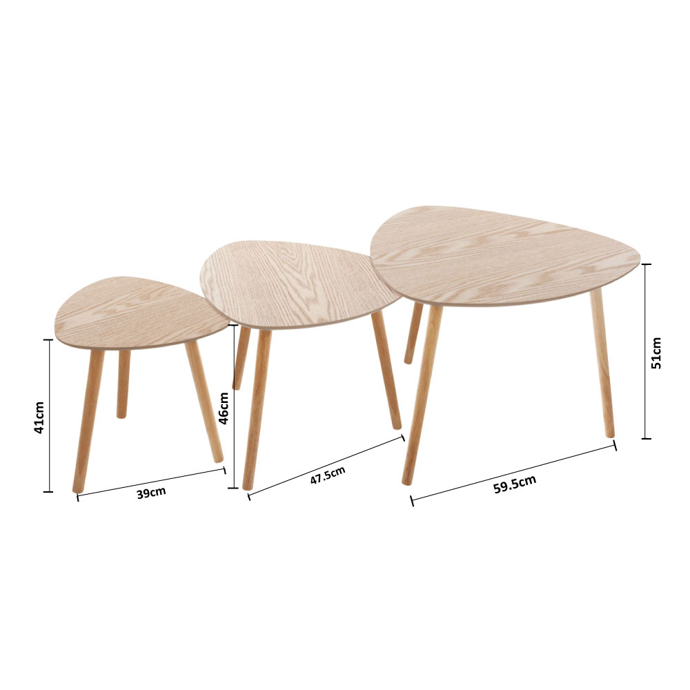 Σετ βοηθητικά τραπεζάκια σε φυσική απόχρωση ξύλου και 3 διαφορετικες διαστάσεις. Ιδανικά για τοποθέτηση στο σαλόνι και σε οποιοδήποτε άλλο χώρο σας ταιριάζουν. Μπορούν να δημιουργήσουν μια σύνθεση όλα μαζί ή να χρησιμοποιήσετε το καθένα χωριστά. Τα προϊόντα έρχονται αμοντάριστα και συναρμολογούνται βάσει οδηγιών.