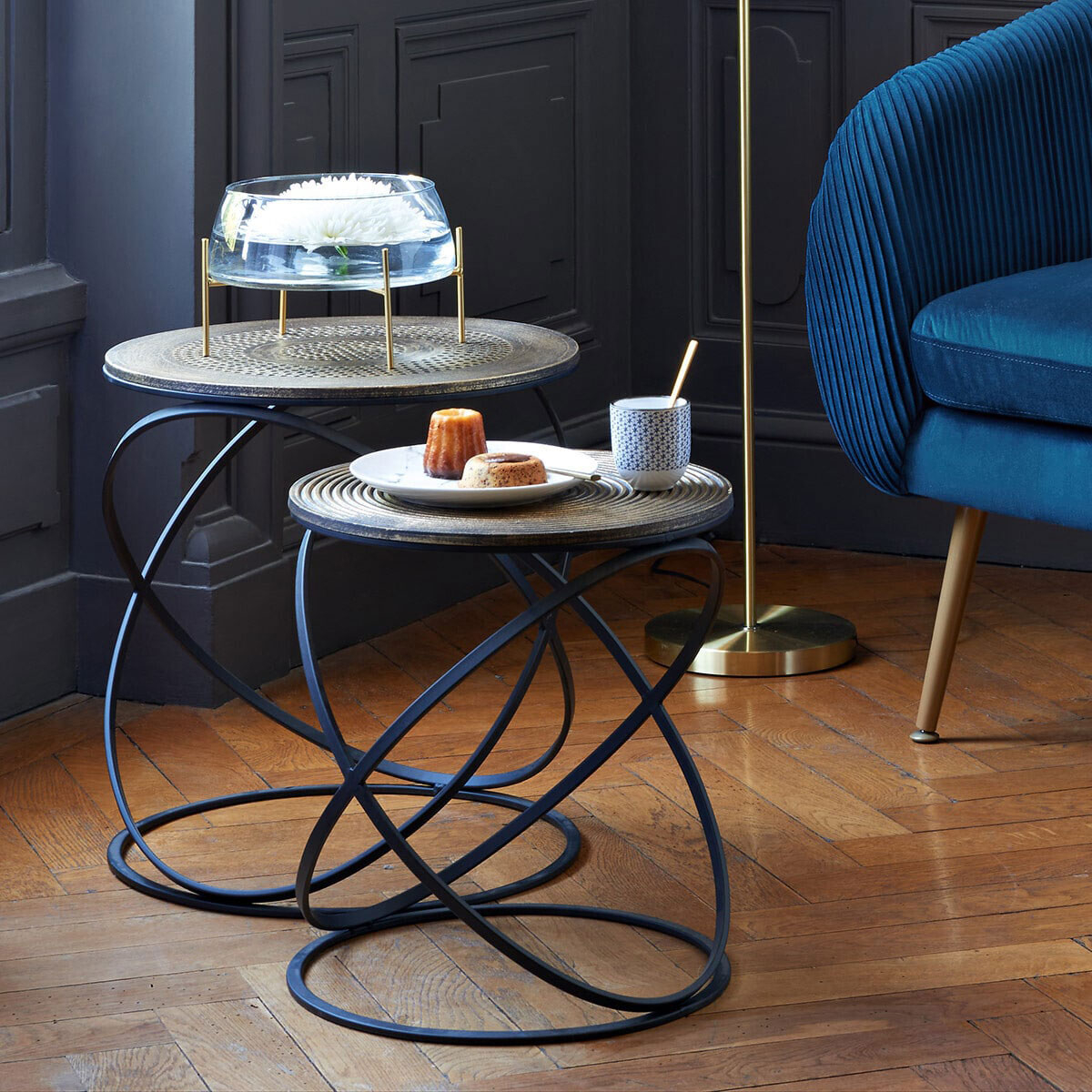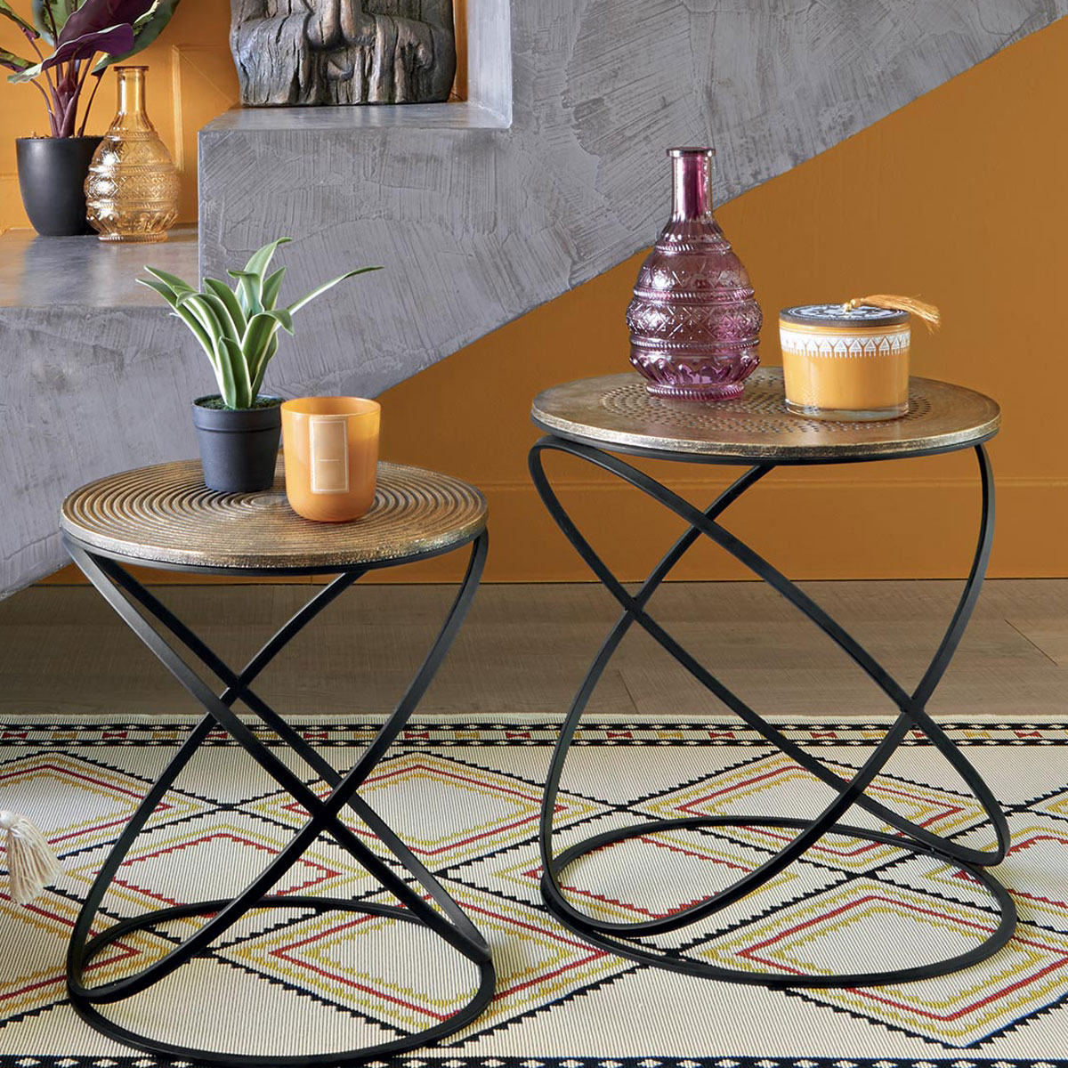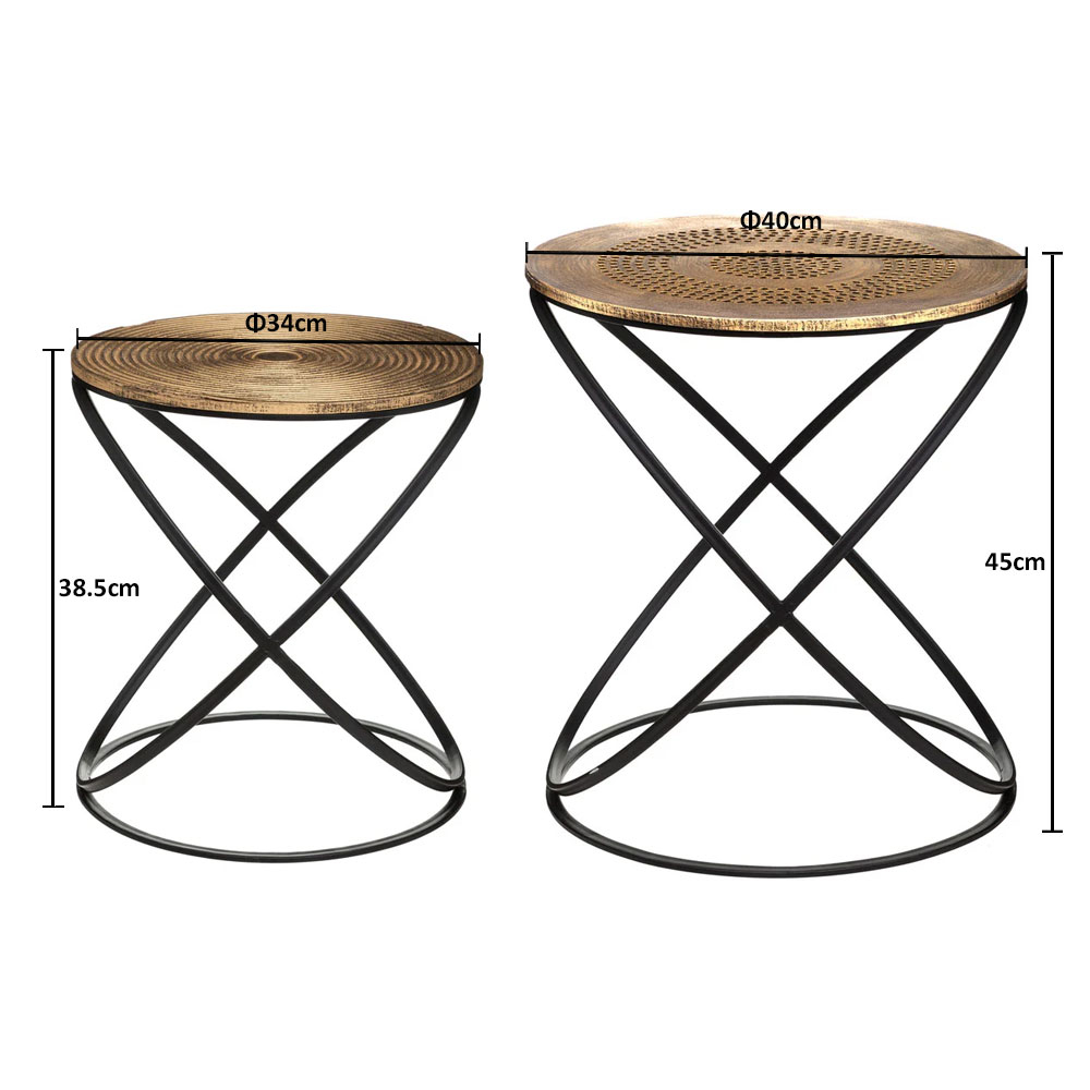 Σετ στρογγυλά τραπεζάκια σε χρυσό-μαύρο χρώμα για χρήση στο σαλόνι, το χολ ή το γραφείο. Ο κομψός σχεδιασμός τους τα καθιστά ιδανικά για να δώσουν στυλ στον χώρο σας.