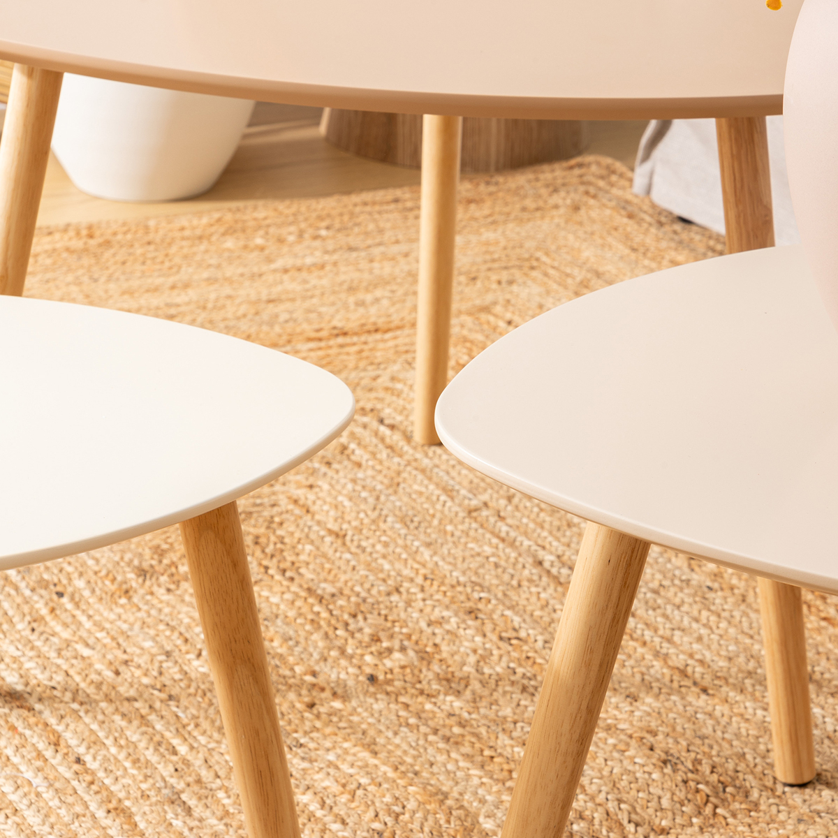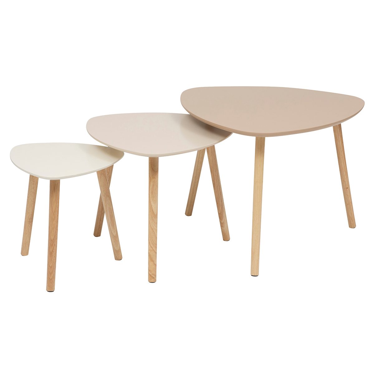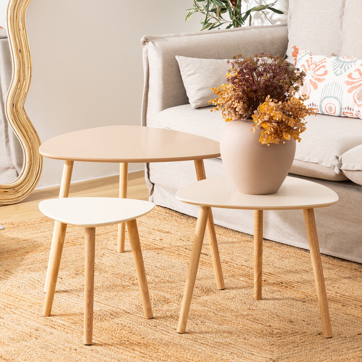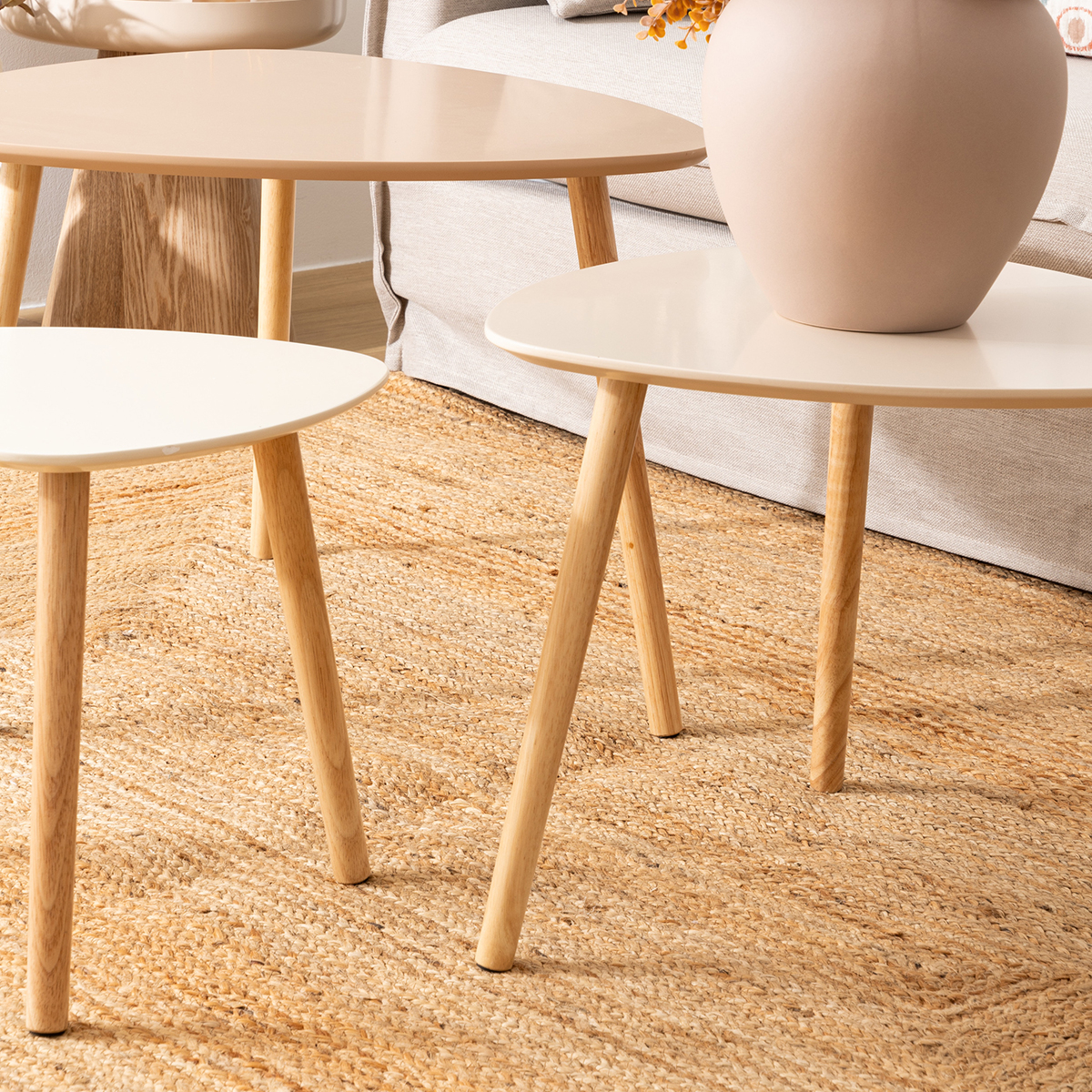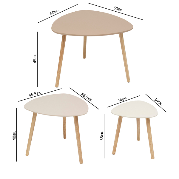 Σετ βοηθητικά τραπεζάκια με μίνιμαλ ύφος σε μπεζ αποχρώσεις και 3 διαφορετικές διαστάσεις. Ιδανικά για τοποθέτηση στο σαλόνι και σε οποιοδήποτε άλλο χώρο σας ταιριάζουν. Μπορούν να δημιουργήσουν μια σύνθεση όλα μαζί ή να τα χρησιμοποιήσετε μεμονωμένα. Τα προϊόντα έρχονται αμοντάριστα και συναρμολογούνται βάσει οδηγιών.