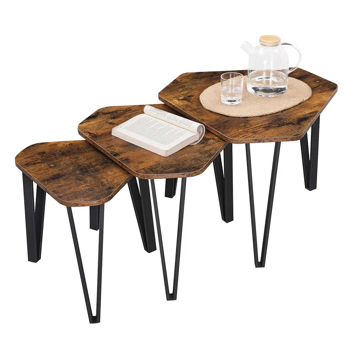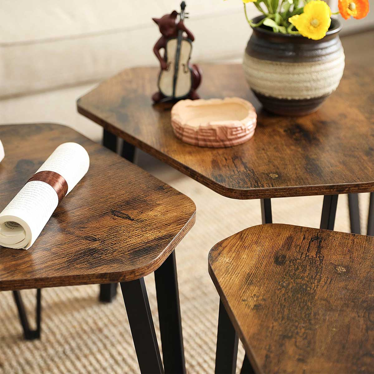 Βοηθητικά τραπεζάκια για το σαλόνι με μοντέρνο σχεδιασμό από την εταιρεία Vasagle. Έχουν επιφάνεια σε φυσικό χρώμα καρυδιάς και μαύρη βάση. Κατασκευασμένα από ανθεκτικά υλικά υψηλής ποιότητας. Ιδανικά για να στολίσουν τον χώρο του καθιστικού σας προσφέροντας σας κομψότητα και λειτουργικότητα. Το προϊόν έρχεται αμοντάριστο και συναρμολογείται βάσει οδηγιών.