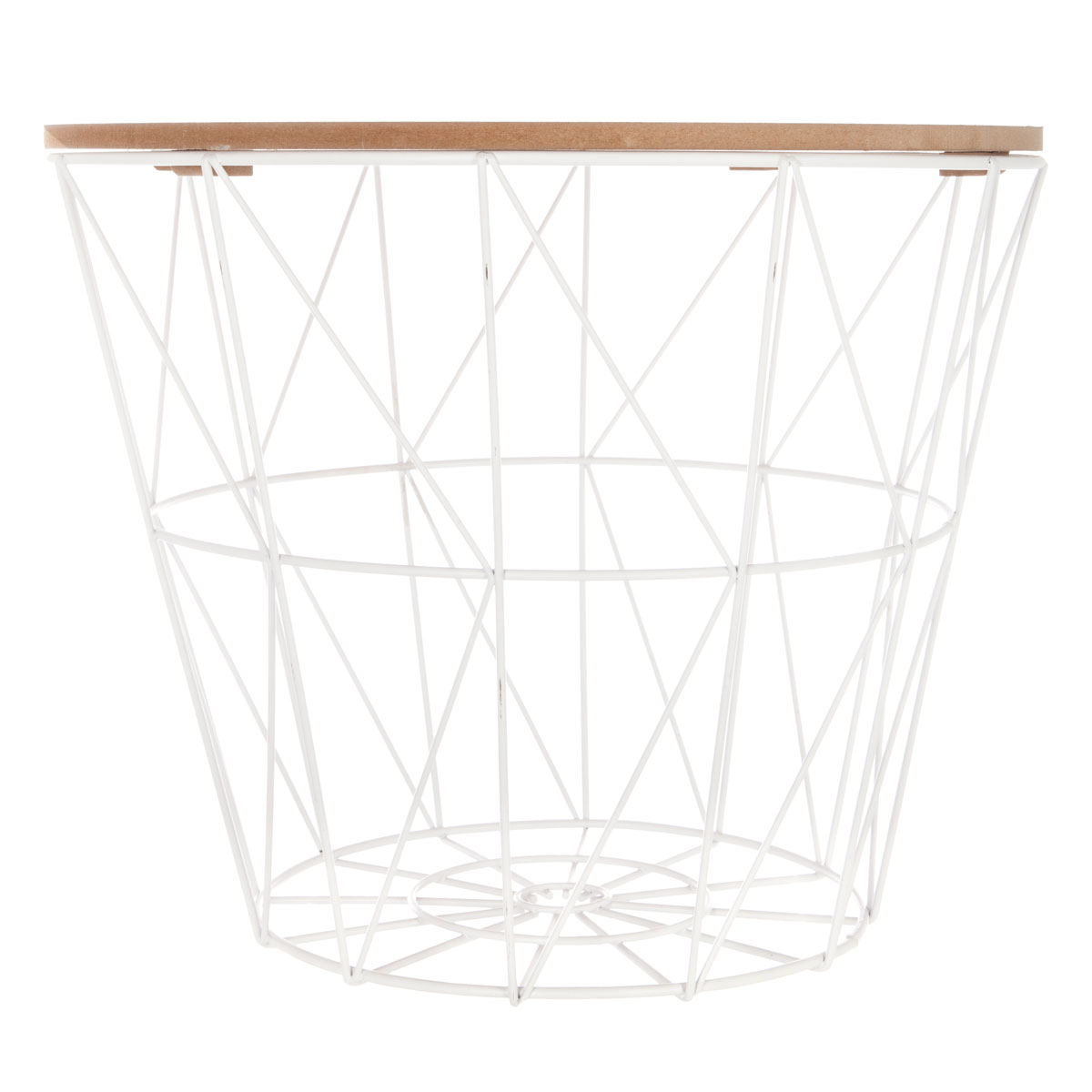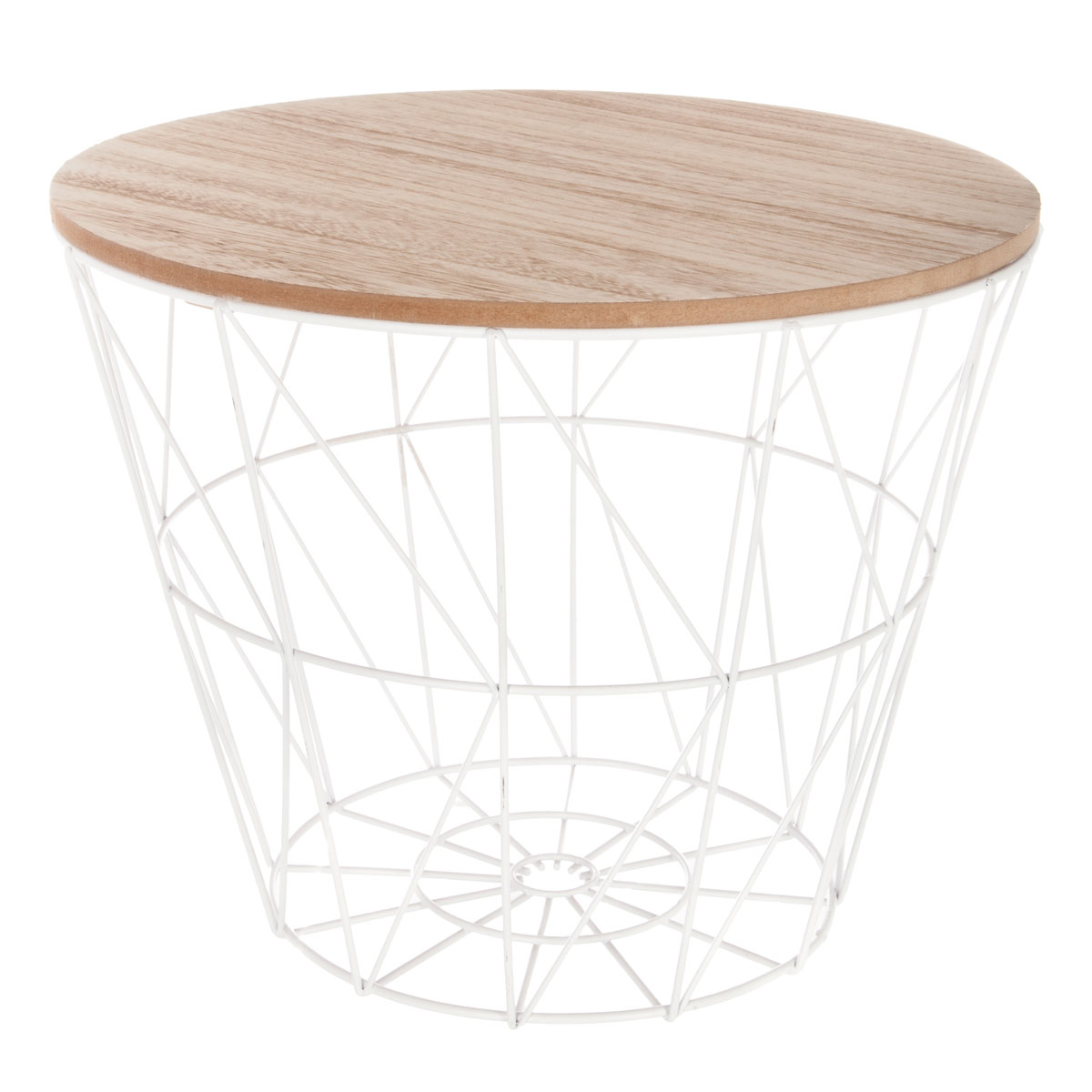 Στρογγυλό τραπεζάκι σε λευκό χρώμα με επιφάνεια σε φυσικό χρώμα ξύλου. Έχει αποθηκευτικό χώρο για να τοποθετείτε τα πράγματά σας και να διατηρείτε τακτοποιημένο τον χώρο σας. Είναι ιδανικό για να το χρησιμοποιήσετε ως βοηθητικό τραπέζι στο σαλόνι, το χωλ, το γραφείο, ή ακόμα και σαν κομοδίνο δίπλα από το κρεβάτι.