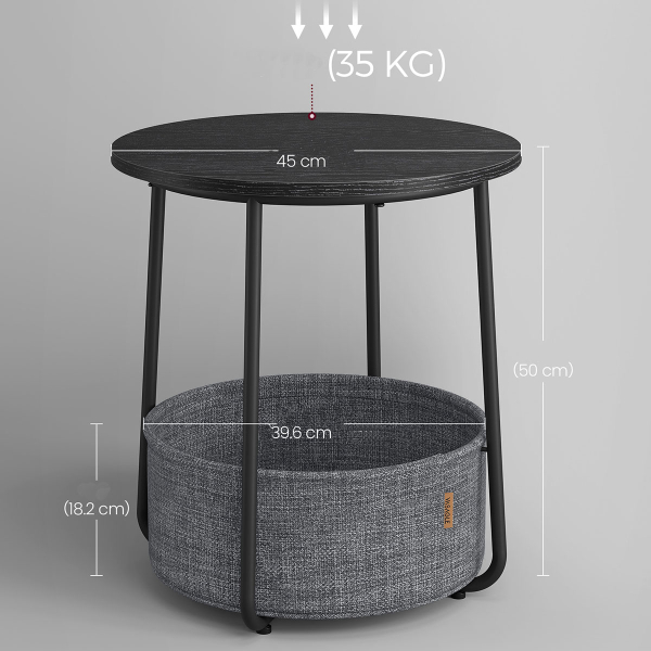 Στρογγυλό τραπεζάκι με αποθηκευτικό χώρο σε μαύρο χρώμα από την εταιρεία Vasagle. Είναι ιδανικό για χρήση ως βοηθητικό τραπέζι στο σαλόνι, το χολ, το γραφείο ή ακόμα και σαν κομοδίνο δίπλα από το κρεβάτι. Το προϊόν έρχεται αμοντάριστο και συναρμολογείται βάσει οδηγιών.