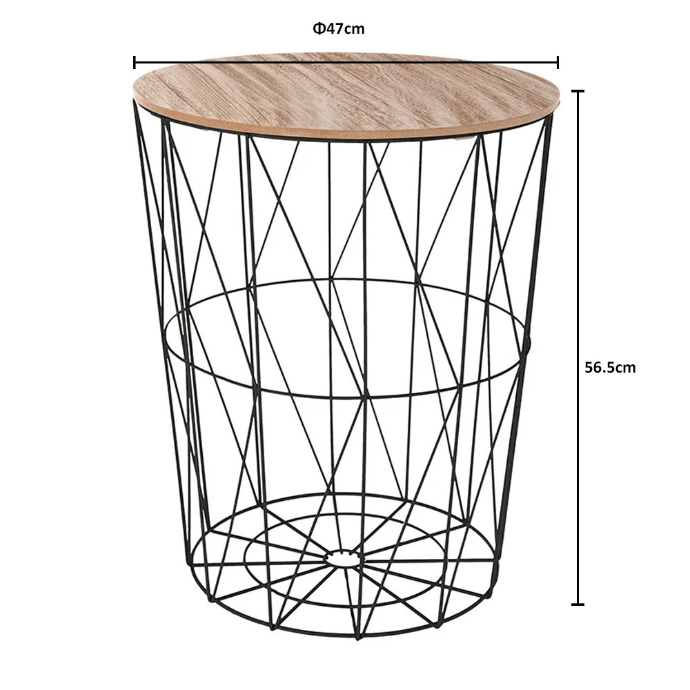 Στρογγυλό τραπεζάκι σε μαύρο χρώμα με επιφάνεια σε φυσικό χρώμα ξύλου. Έχει αποθηκευτικό χώρο για να τοποθετείτε τα πράγματά σας και να διατηρείτε τακτοποιημένο τον χώρο σας. Είναι ιδανικό για χρήση ως βοηθητικό τραπέζι στο σαλόνι, το χωλ, το γραφείο, ή ακόμα και σαν κομοδίνο δίπλα από το κρεβάτι.