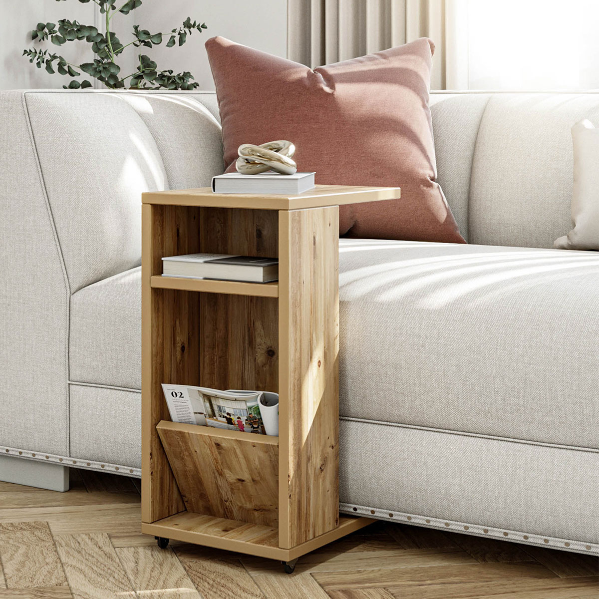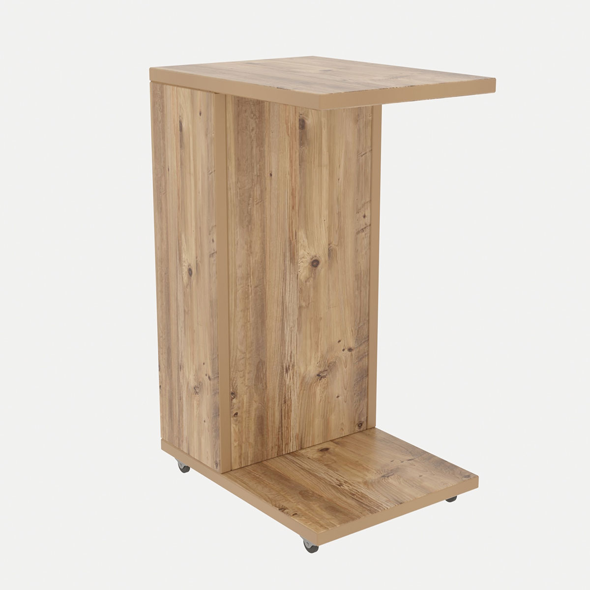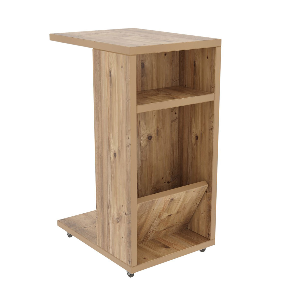 Βοηθητικό τραπεζάκι σαλονιού σε φυσική απόχρωση ξύλου με μίνιμαλ σχεδιασμό. Διαθέτει ράφια για να αποθηκεύετε περιοδικά, βιβλία ή μικροαντικείμενα και ροδάκια για να το μετακινείτε εύκολα. Ιδανικό για χρήση ως βοηθητικό τραπέζι στο σαλόνι, το χολ, το γραφείο, ή ακόμα και σαν κομοδίνο δίπλα από το κρεβάτι. Το προϊόν έρχεται αμοντάριστο και συναρμολογείται βάσει οδηγιών.