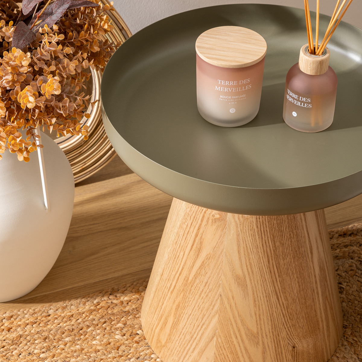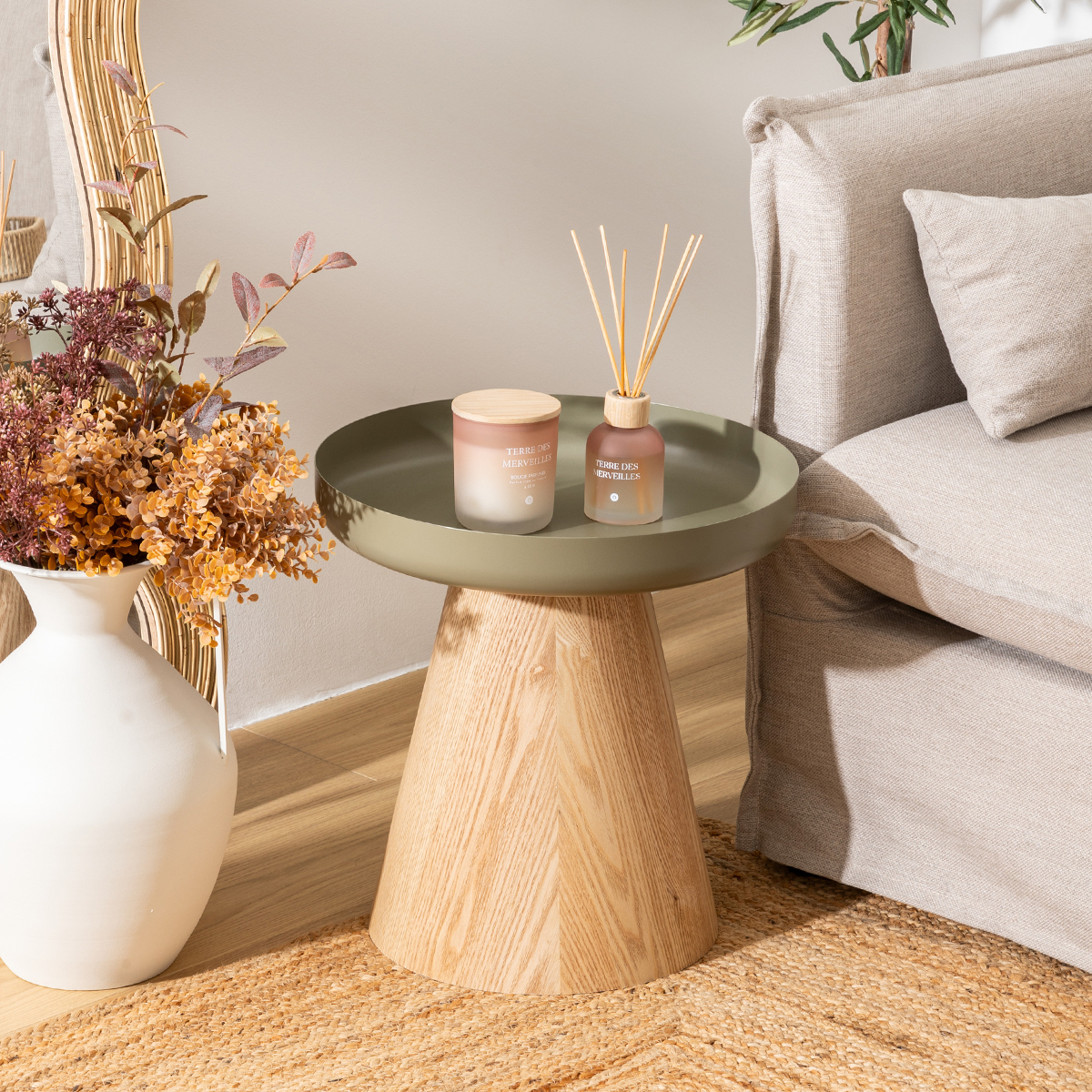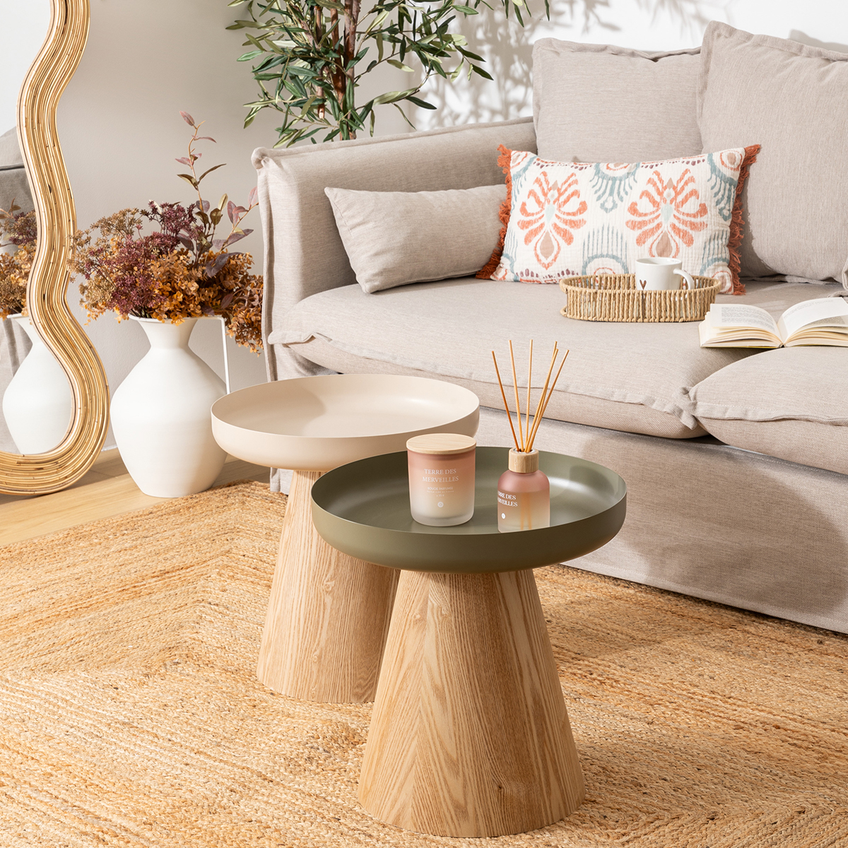 Βοηθητικό τραπεζάκι με μοντέρνο ύφος σε μπεζ χρώμα και χακί επιφάνεια. Ιδανικό για τοποθέτηση στο σαλόνι και σε οποιοδήποτε άλλο χώρο σας ταιριάζει.
