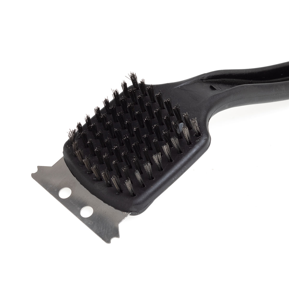 Βούρτσα καθαρισμού για τη σχάρα του barbeque. Στο πάνω μέρος διαθέτει μεταλλική ξύστρα για τα επίμονα υπολείμματα. Είναι σε μαύρο χρώμα κατασκευασμένη από πολυπροπυλένιο.