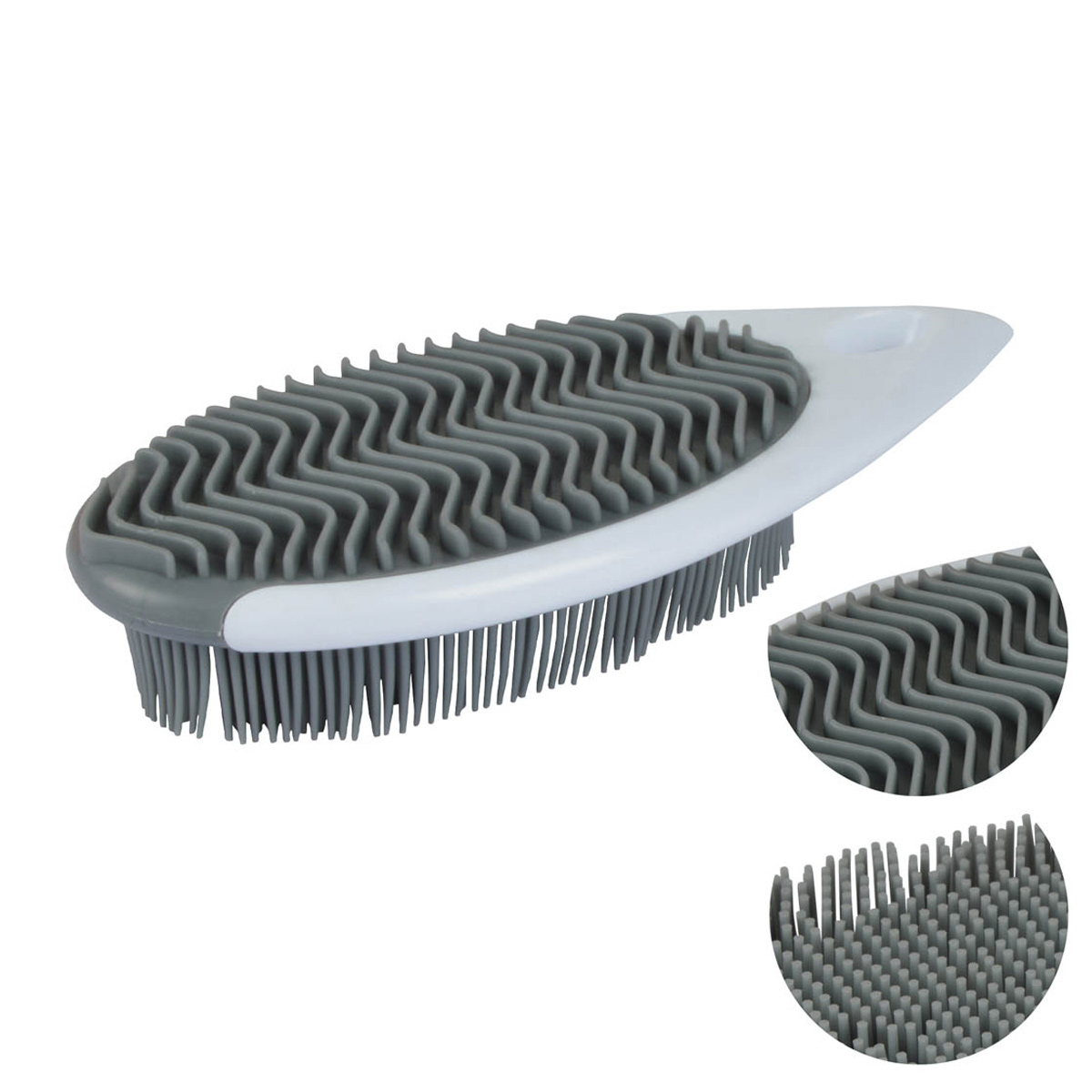 Βούρτσα διπλής όψης από σιλικόνη σε ανθρακί χρώμα. Η μια πλευρά διαθέτει λεπτές τριχούλες για λεπτομερή και απαλό καθαρισμό χωρίς γρατσουνιές, ενώ η άλλη διαθέτει πιο σκληρή σιλικόνη σε κυματιστό σχέδιο. Μπορεί να χρησιμοποιηθεί για το πλύσιμο του νεροχύτη, για έπιπλα και υφάσματα καθώς μαγνητίζει τη σκόνη και τα χνούδια. Διαθέτει θηλάκι για να το κρεμάτε.