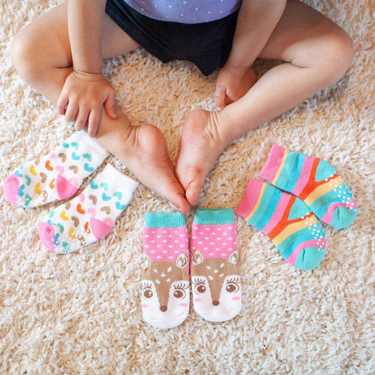 Σετ 3 ζεύγη παιδικές αντιολισθητικές κάλτσες από την εταιρία Zoocchini. Το ένα ζεύγος έχει μπεζ-ροζ χρώμα και σχέδιο ελαφάκι, το άλλο λευκό φόντο, πολύχρωμες λεπτομέρειες και σχέδιο καρδούλες και το άλλο ριγέ σχέδιο με πολύχρωμες λεπτομέρειες. Η σύνθεσή τους αποτελείται από 79% βαμβάκι, 18% polyester, 3% spandex. Στο κάτω μέρος διαθέτουν αντιολισθητικά βεντουζάκια για να μην γλιστράει το μικρό σας, ενώ είναι άνετα και πλούσια για να αναπτύσσεται το πόδι και να κινείται άνετα. Κατάλληλο για ηλικίες από 0+ μηνών έως 2 ετών.