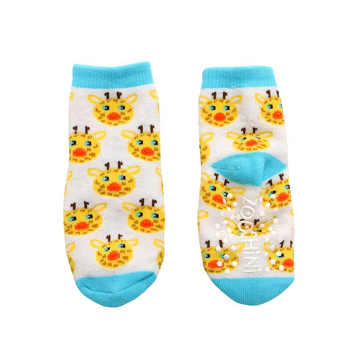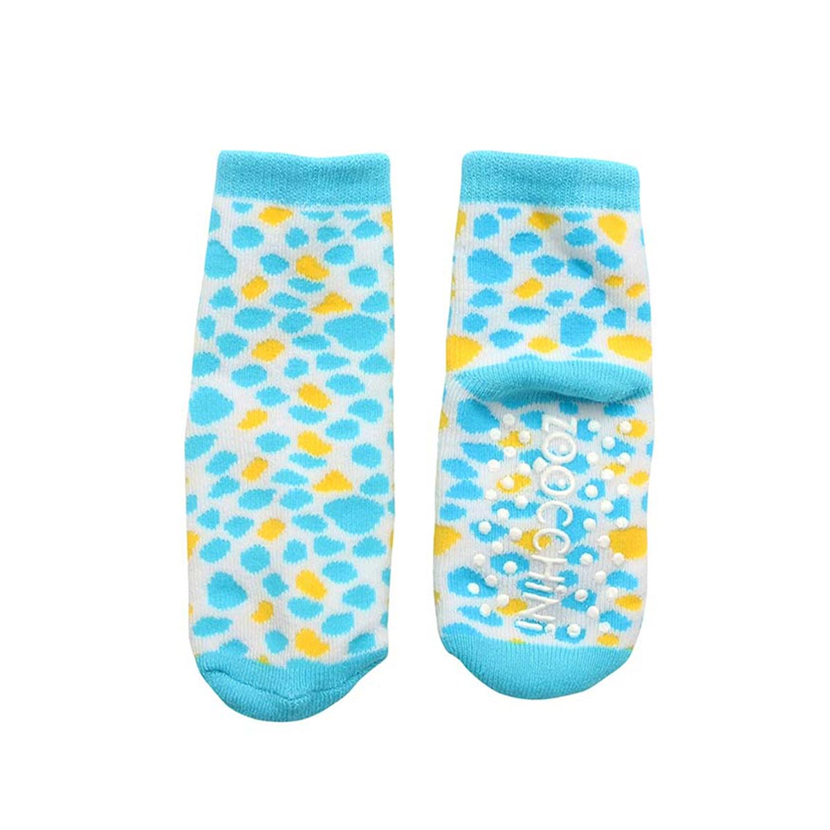 Σετ 3 ζεύγη παιδικές αντιολισθητικές κάλτσες από την εταιρία Zoocchini. Το ένα ζεύγος έχει γαλάζιο χρώμα, κίτρινες λεπτομέρειες και σχέδιο καμηλοπάρδαλη, το άλλο λευκό φόντο, κίτρινες λεπτομέρειες και σχέδιο καμηλοπαρδάλεις και το άλλο μοντέρνο σχέδιο σε γαλάζιες-κίτρινες αποχρώσεις. Η σύνθεσή τους αποτελείται από 79% βαμβάκι, 18% polyester, 3% spandex. Στο κάτω μέρος διαθέτουν αντιολισθητικά βεντουζάκια για να μην γλιστραέι το μικρό σας, ενώ είναι άνετα και πλούσια για να αναπτύσσεται το πόδι και να κινείται άνετα. Κατάλληλο για ηλικίες από 0+ μηνών έως 2 ετών.