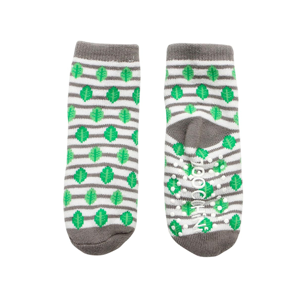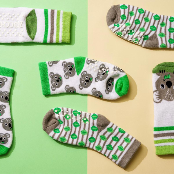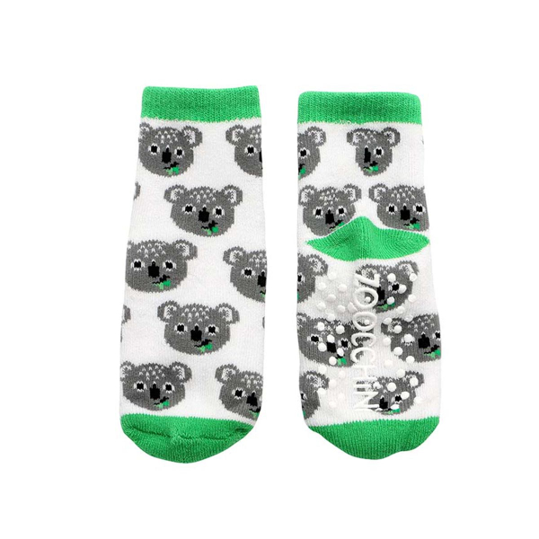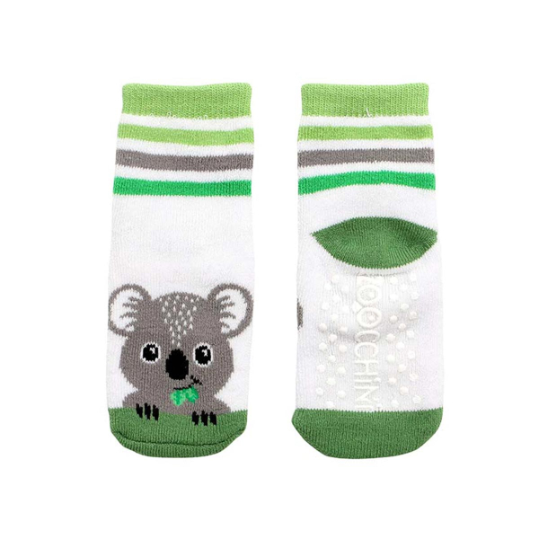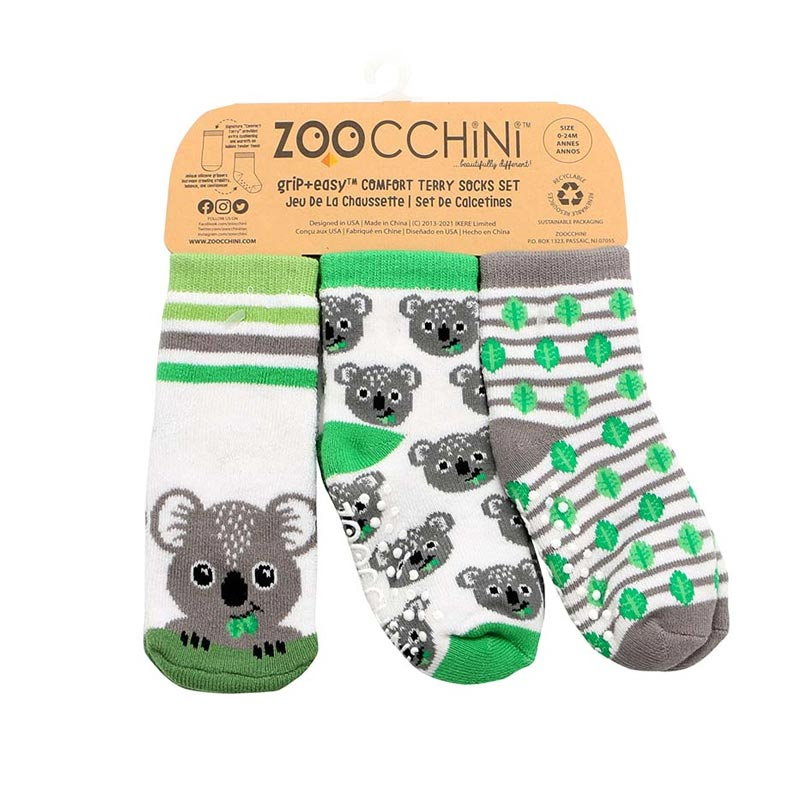 Σετ 3 ζεύγη παιδικές αντιολισθητικές κάλτσες από την εταιρία Zoocchini. Το ένα ζεύγος έχει πράσινο-λευκό χρώμα και σχέδιο κοάλα, το άλλο λευκό φόντο, γκρι-πράσινες λεπτομέρειες και σχέδιο κοάλα και το άλλο έχει ριγέ σχέδιο σε γκρι-πράσινες αποχρώσεις. Η σύνθεσή τους αποτελείται από 79% βαμβάκι, 18% polyester, 3% spandex. Στο κάτω μέρος διαθέτουν αντιολισθητικά βεντουζάκια για να μην γλιστραέι το μικρό σας, ενώ είναι άνετα και πλούσια για να αναπτύσσεται το πόδι και να κινείται άνετα. Κατάλληλο για ηλικίες από 0+ μηνών έως 2 ετών.