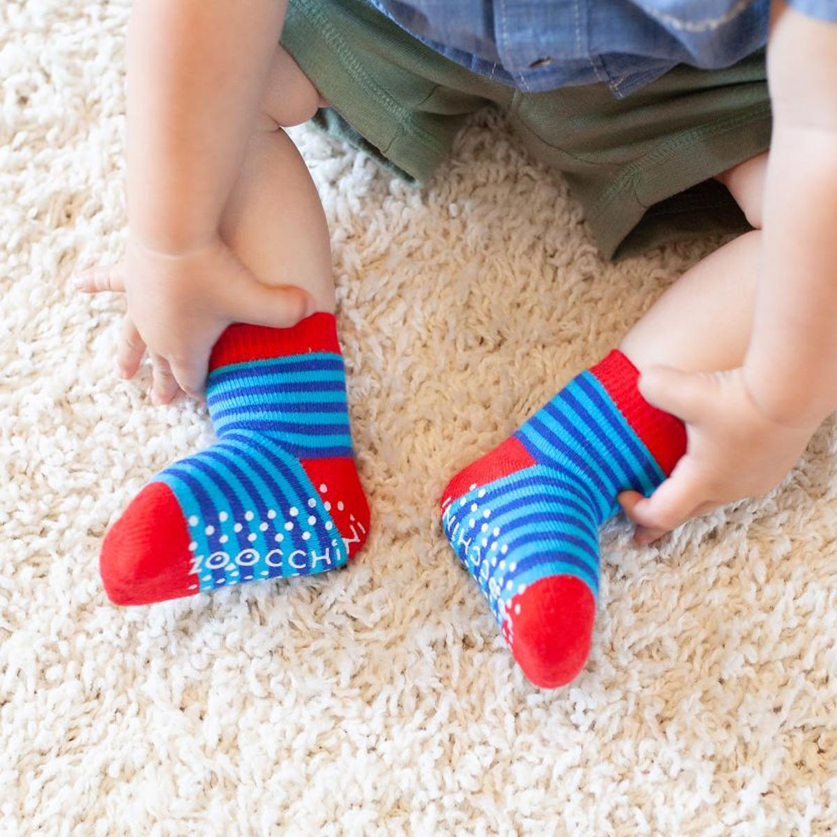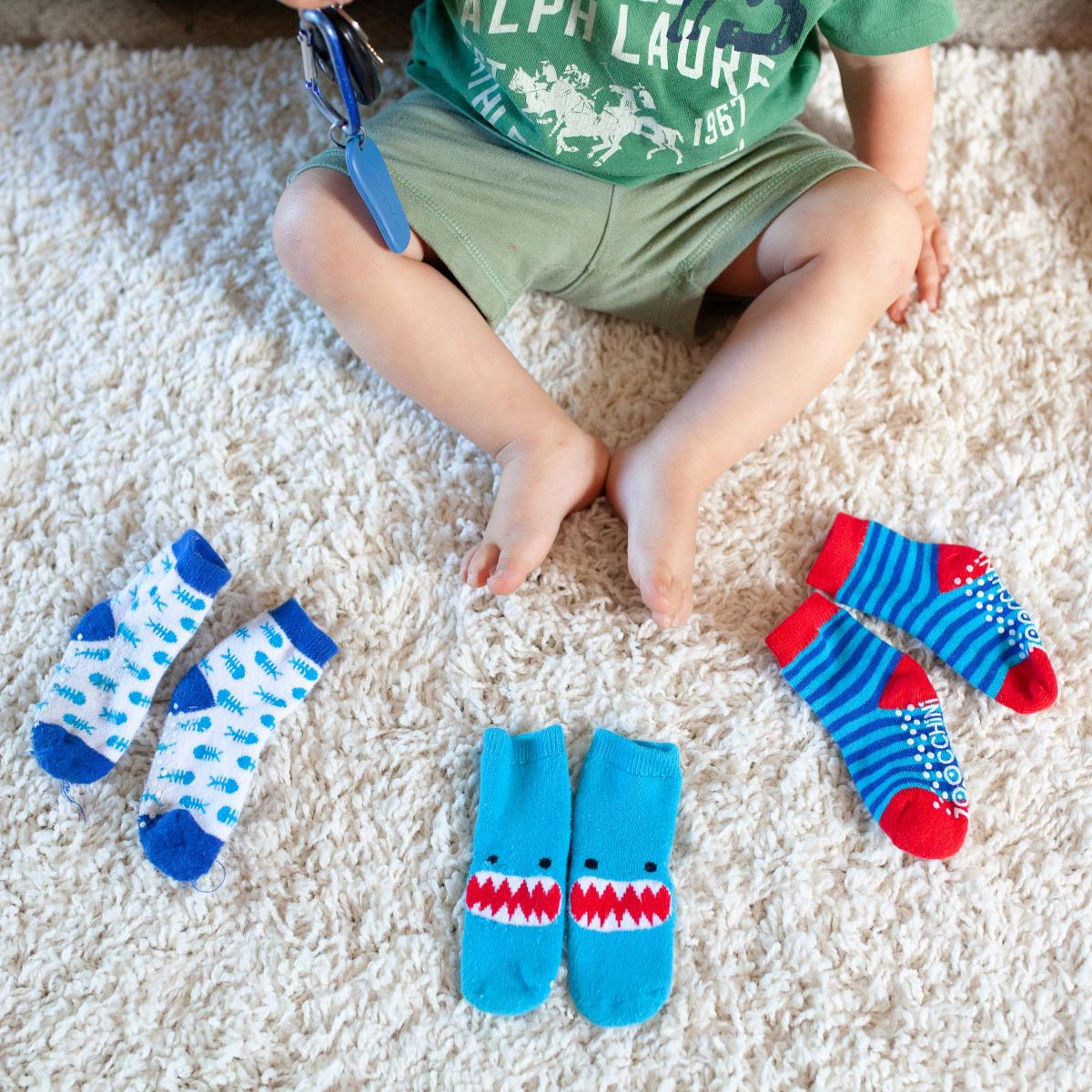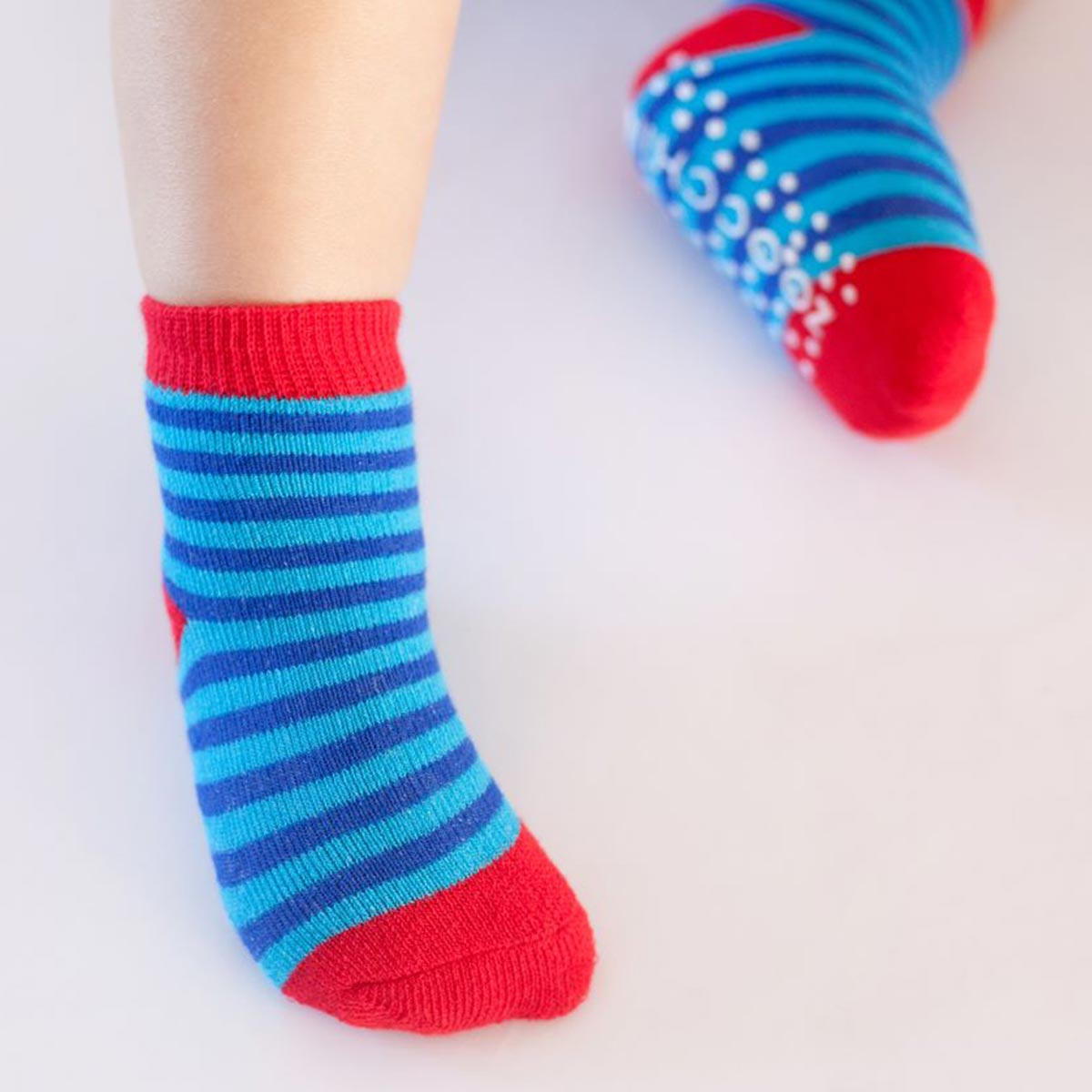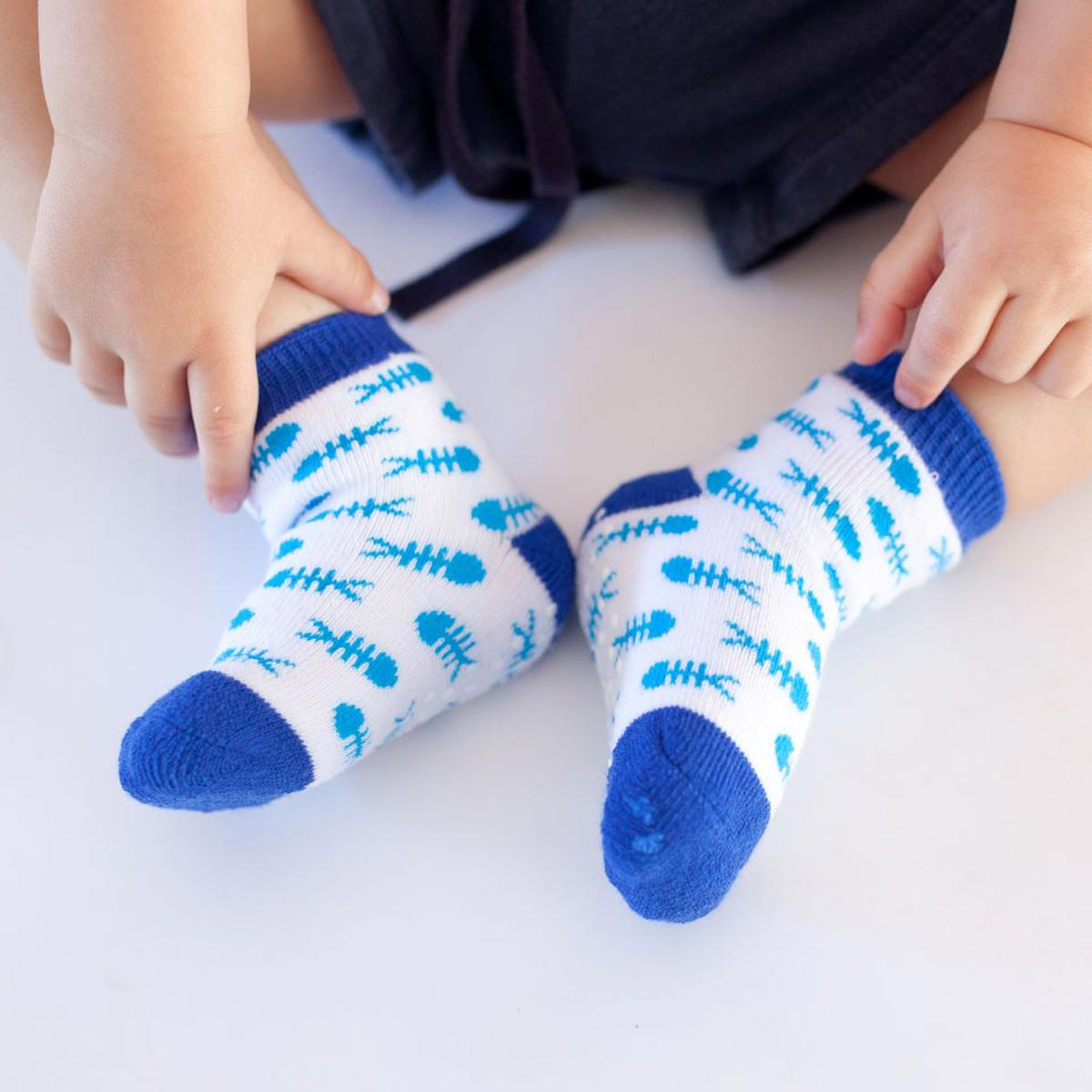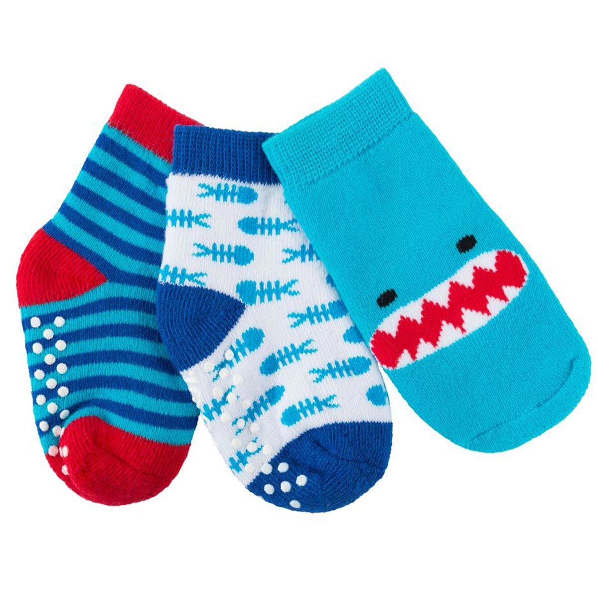 Σετ 3 ζεύγη παιδικές αντιολισθητικές κάλτσες από την εταιρία Zoocchini. Το ένα ζεύγος έχει γαλάζιο χρώμα με σχέδιο καρχαρία, το άλλο λευκό φόντο, μπλε-γαλάζιες λεπτομέρειες και σχέδιο ψαροκόκαλο ενώ το άλλο ριγέ σχέδιο με μπλε-κόκκινες λεπτομέρειες. Η σύνθεσή τους αποτελείται από 79% βαμβάκι, 18% polyester, 3% spandex. Στο κάτω μέρος διαθέτουν αντιολισθητικά βεντουζάκια για να μην γλιστράει το μικρό σας, ενώ είναι άνετα και πλούσια για να αναπτύσσεται το πόδι και να κινείται άνετα. Κατάλληλο για ηλικίες από 0+ μηνών έως 2 ετών.