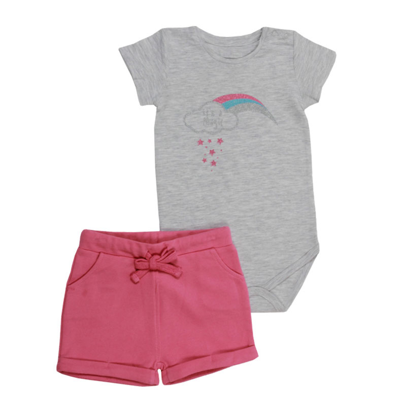 Σετ βρεφικά ρούχα από την εταιρεία Minene. Είναι κατασκευασμένα από 100% βαμβάκι που τα καθιστά πολύ μαλακά και απαλά. Αποτελείται από κοντομάνικη μπλούζα σε γκρι χρώμα με πολύχρωμο μοντέρνο σχέδιο. Διαθέτει μονόχρωμο φούξια σορτσάκι με λάστιχο στη μέση. Έχει clips ασφαλείας στο κάτω μέρος αλλά και στο λαιμό για εύκολο άλλαγμα.