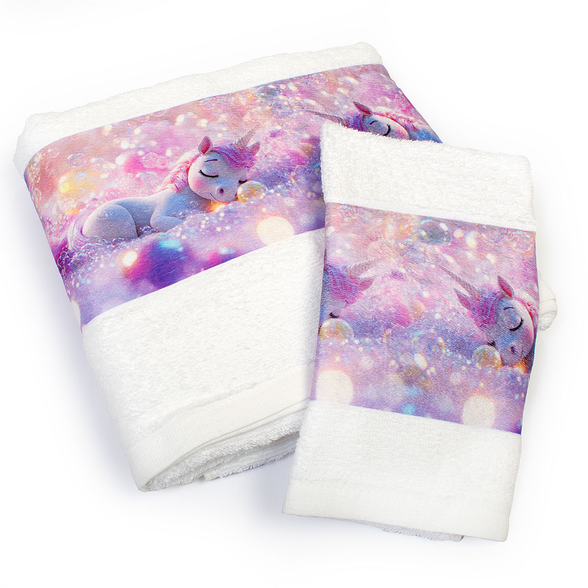 Σετ βρεφικές πετσέτες σε λευκό χρώμα από την εταιρεία Dimcol. Έχουν φάσα ψηφιακής εκτύπωσης με σχέδιο μονόκερο σε ροζ-μωβ αποχρώσεις. Είναι κατασκευασμένες από 100% βαμβάκι βάρους 400γραμ./τ.μ. που τις κάνει να ξεχωρίζουν για την υψηλή απορροφητικότητα και την εξαιρετική ποιότητά τους. Συσκευασία κουτί.