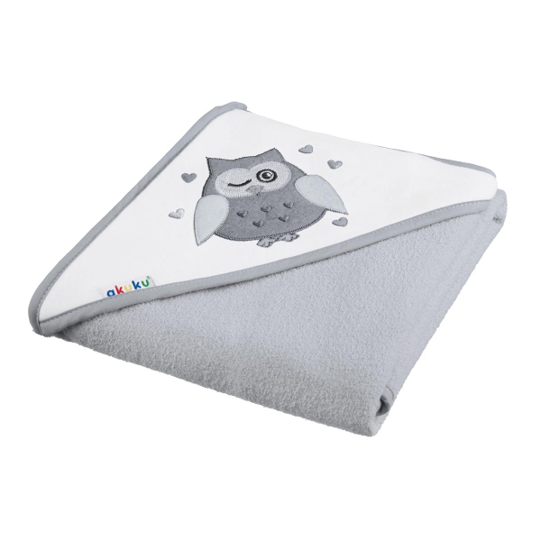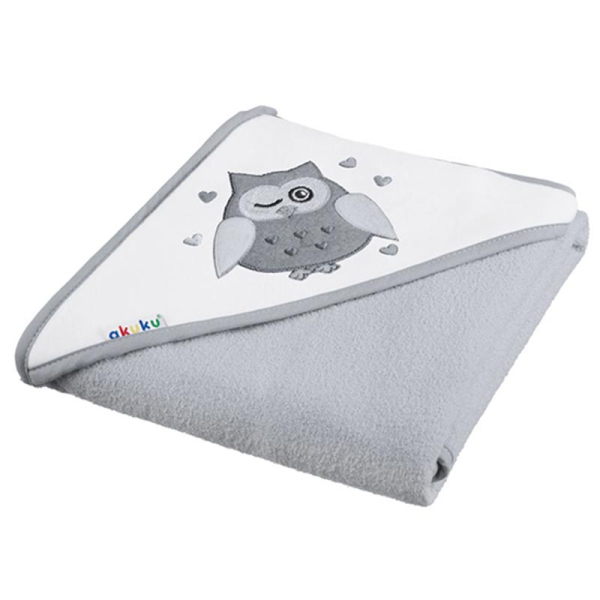 Βρεφική κάπα σε γκρι χρώμα και σχέδιο κουκουβάγια από την εταιρία Akuku. Είναι κατασκευασμένη από 100% υψηλής ποιότητας βαμβάκι terry, είναι εξαιρετικά μαλακή και απορροφητική. Είναι ελαφριά και χαλαρή χωρίς να βαραίνει το μικρό σας ενώ το περιμετρικό ρέλι προστατεύει το κεφαλάκι του από το κρύο. Η μία της πλευρά έχει πετσετέ όψη και η άλλη έχει φλις υφή για να απορροφάται ευκολότερα το νερό αλλά και να μην κρυώνει μετά το μπάνιο. Ιδανική πετσέτα για το ντους ή το μπάνιο του μικρού σας.