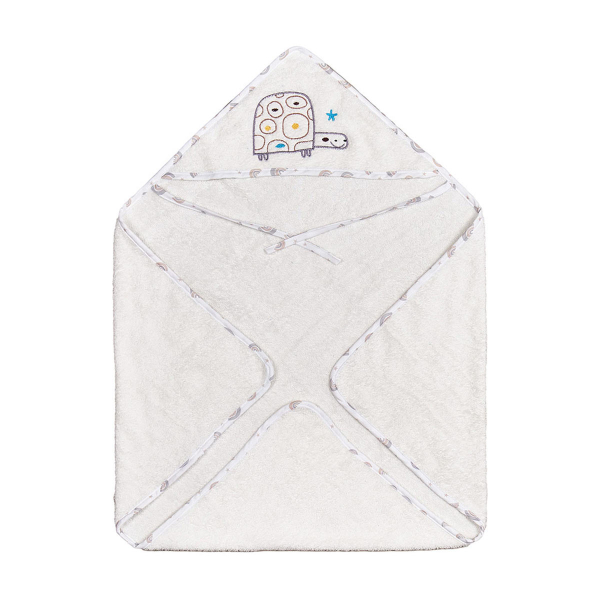 Βρεφική κάπα της εταιρείας Κόσμος του Μωρού σε εκρού χρώμα με ρέλι περιμετρικά και κεντητό σχέδιο χελώνα. Είναι κατασκευασμένη από 100% βαμβακερή πετσέτα και μπορεί να δεθεί με τα κορδόνια που διαθέτει για μεγαλύτερη σταθερότητα. Υποαλλεργική, ιδιαίτερα απαλή και απορροφητική για το μωρό σας. Είναι ιδανική για βρέφη έως 6 μηνών.