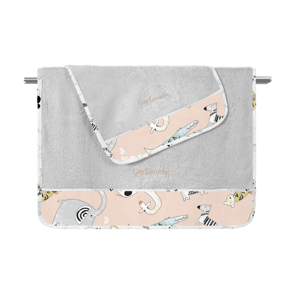 Βρεφική κάπα για το μπάνιο του μωρού σας από την εταιρεία Guy Laroche. Είναι γκρι, έχει υφασμάτινη κουκούλα και σιρίτι με σχέδιο ζωάκια και μπεζ-σομόν λεπτομέρειες. Κατασκευασμένη από 100% βαμβάκι. Συνδυάστε την με τα υπόλοιπα είδη της ίδιας σειράς για ένα ολοκληρωμένο αποτέλεσμα.