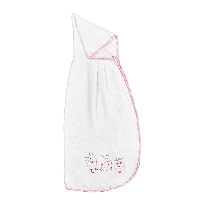 Βρεφική κάπα της εταιρείας Κόσμος του Μωρού σε λευκό χρώμα με ροζ λεπτομέρειες, κεντητό σχέδιο ζωάκια και περιμετρικό ρέλι. Είναι κατασκευασμένη από 100% βαμβακερή πετσέτα και μπορεί να δεθεί με τα κορδόνια που διαθέτει για μεγαλύτερη σταθερότητα. Υποαλλεργική, πολύ απαλή και απορροφητική για το μωρό σας. Ιδανική για βρέφη από 0 έως 18 μηνών.