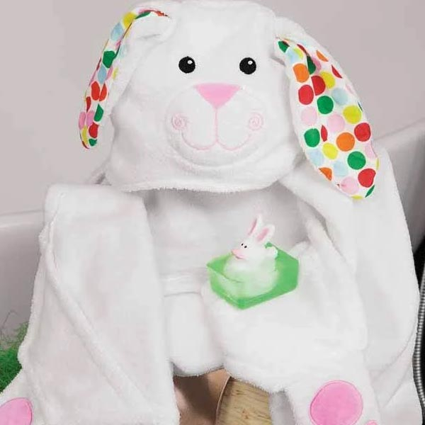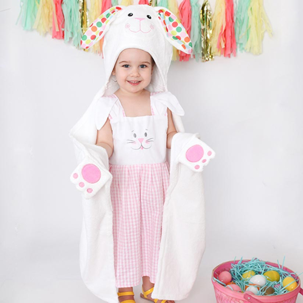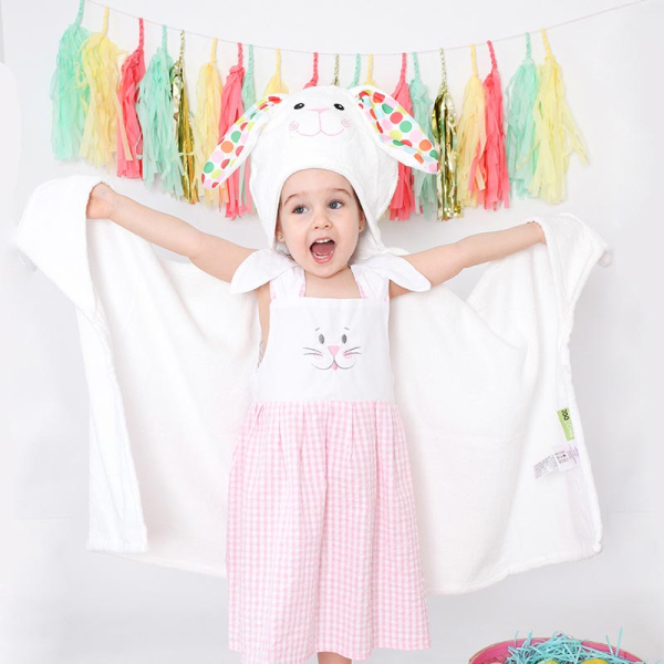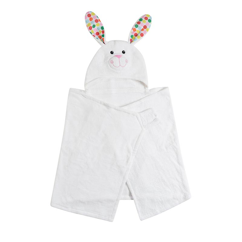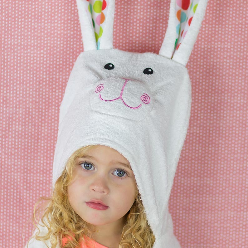 Παιδική πετσέτα με κουκούλα σε λευκό χρώμα και σχέδιο λαγουδάκι από την εταιρία Zoocchini. Είναι κατασκευασμένη από 100% υψηλής ποιότητας βαμβάκι που δεν κάνει νήματα, καθιστώντας την εξαιρετικά μαλακή και απορροφητική. Για την επίτευξη της μέγιστης άνεσης, στο εσωτερικό της κουκούλας διαθέτει έξτρα βαμβάκι. Ιδανική για μετά το μπάνιο ή την πισίνα. Κατάλληλη για ηλικίες από 2 έως 6 ετών.
