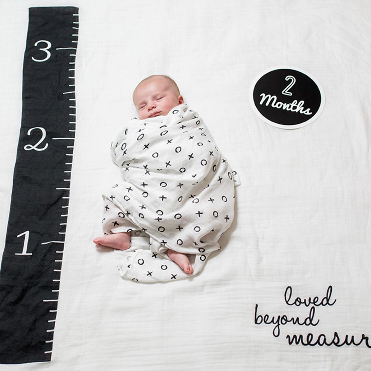 Σεντόνι μηνιαίας φωτογράφισης μωρού με λευκό φόντο, μαύρες λεπτομέρειες και μοντέρνο σχέδιο από την εταιρία Lulujo. Είναι κατασκευασμένο από 100% βαμβάκι με ύφασμα που αναπνέει και μπορεί να χρησιμοποιηθεί σαν κουβερτούλα για το καρότσι ή και για κουβέρτα θηλασμού. Μαζί με το σεντόνι θα πάρετε και 7 κάρτες διπλής όψης με 14 ορόσημα για τον πρώτο χρόνο του μωρού. Ιδανικό για να δημιουργήσετε ένα μοναδικό άλμπουμ αναμνηστικών φωτογραφιών για εσάς και το μικρό σας. Αποτελεί μοναδική πρόταση δώρου για νεογέννητα μωράκια.