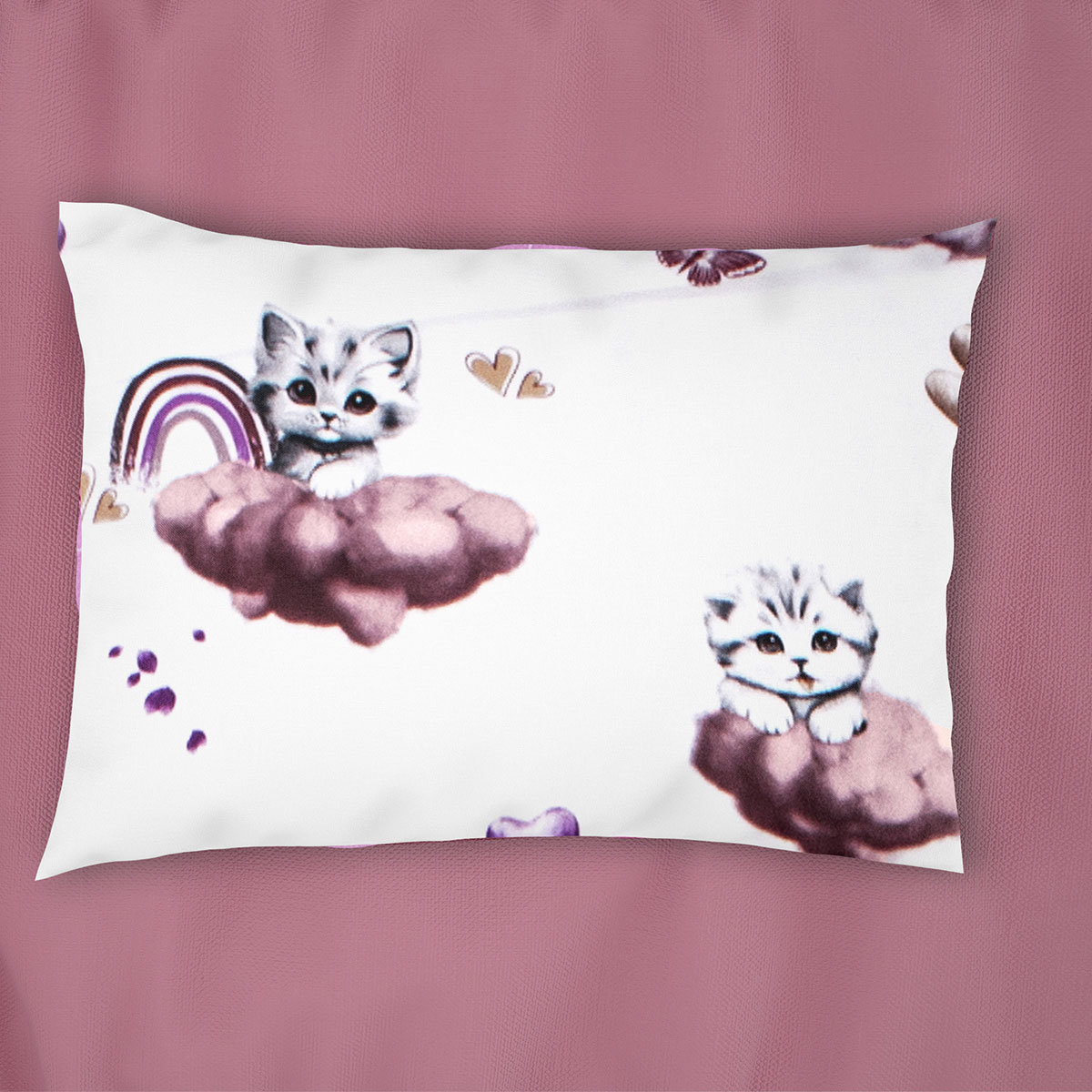 Βρεφική μαξιλαροθήκη φάκελος σε λευκό φόντο, με ροζ-μωβ λεπτομέρειες και σχέδιο γατούλα της εταιρείας Dimcol. Είναι κατασκευασμένη από 100% βαμβάκι 144 κλωστών που προσφέρει απαλότητα. Συνδυάστε την με τα υπόλοιπα είδη της ίδιας σειράς για ένα ολοκληρωμένο αποτέλεσμα.