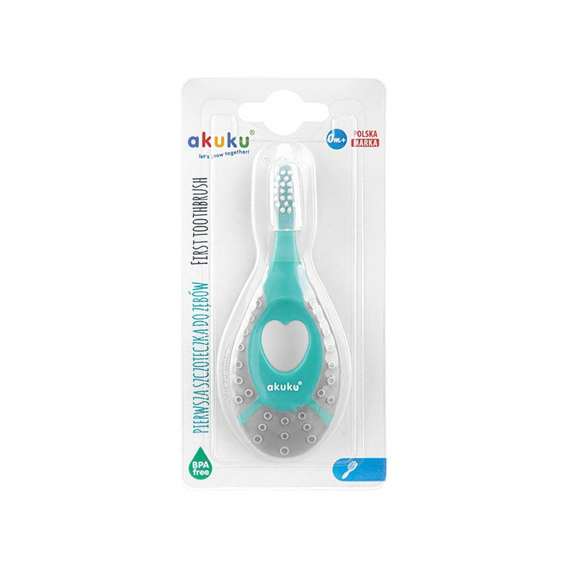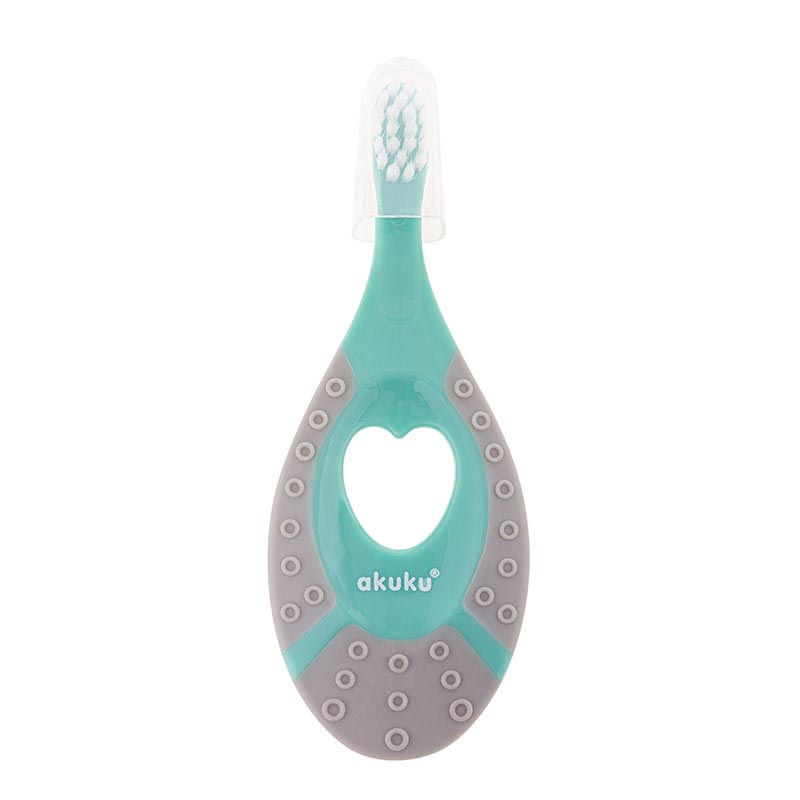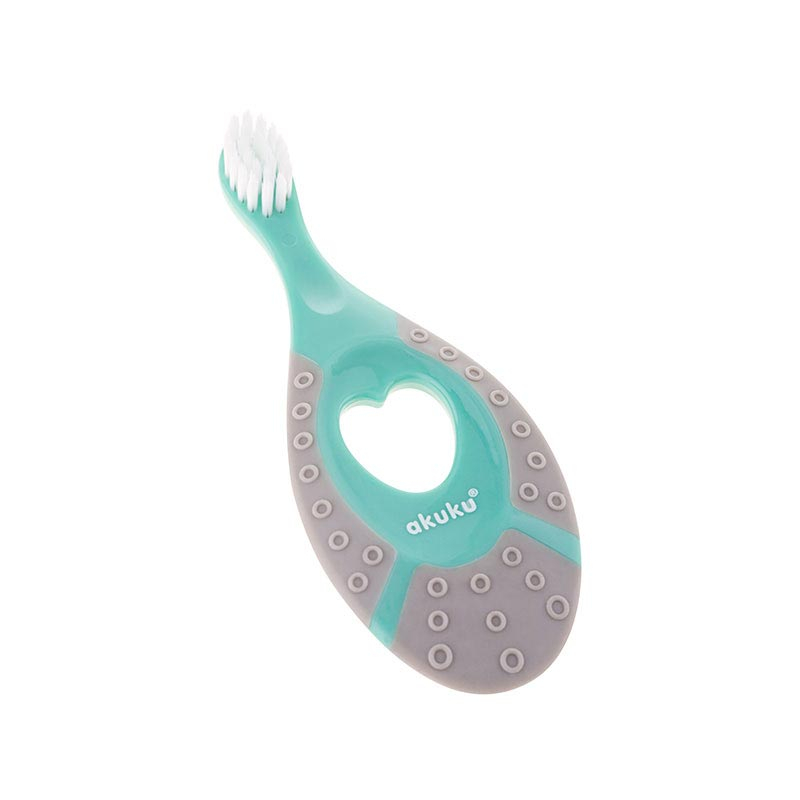 Βρεφική οδοντόβουρτσα σε γκρι-τυρκουάζ χρώμα και μοντέρνο σχέδιο από την εταιρία Akuku. Είναι απαλλαγμένη από BPA και PVC, ενώ το κάτω μέρος διαθέτει ανάγλυφη υφή για να μπορεί το μικρό σας να την χρησιμοποιήσει και σαν μασητικό. Ειδικά σχεδιασμένη για να συμπεριφέρεται με απαλότητα και σεβασμό για ούλα και τα δοντάκια του μικρού σας.
