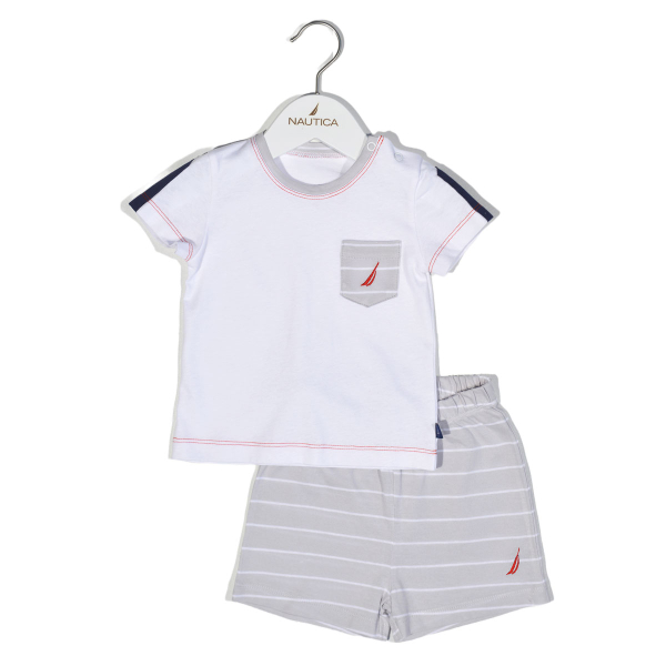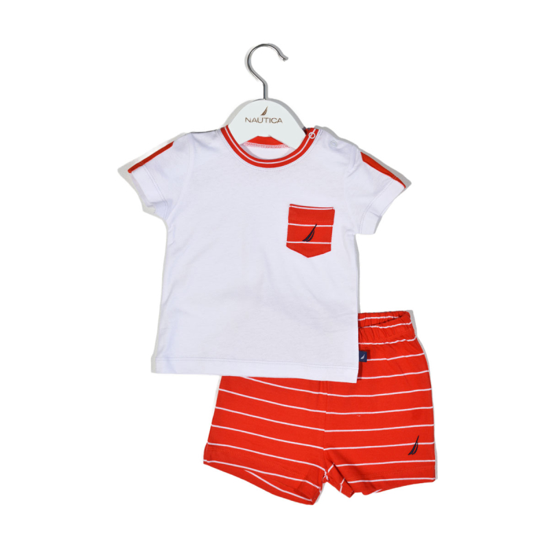 Σετ βρεφικά ρούχα αποτελούμενο από 1 σορτς και 1 μπλούζα της εταιρείας Nautica. Το ύφασμά τους έχει σύνθεση από 100% οργανικό βαμβάκι βάρους 160γρ./τ.μ. που τα καθιστά πολύ μαλακά και απαλά. Η μπλούζα είναι λευκή, με την τσέπη, την λαιμόκοψη και το πάνω μέρος των μανικιών να είναι κόκκινο. Κλείνει στον ώμο με 2 clips (σούστες). Το σορτσάκι έχει κόκκινο χρώμα με ριγέ σχέδιο και λευκές λεπτομέρειες ενώ εφαρμόζει τέλεια χάρη στο λάστιχο που διαθέτει στην μέση.