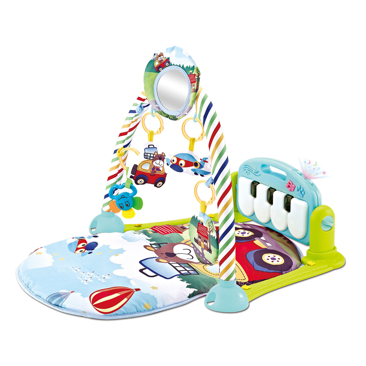 Εκπαιδευτικό γυμναστήριο από την εταιρία Kikka Boo σε γαλάζιο χρώμα με πολύχρωμες λεπτομέρειες και σχέδιο ζωάκια. Το μαλακό στρωματάκι στηρίζει απαλά το σώμα του παιδιού και είναι κατάλληλο για να ξαπλώνει το παιδί, να είναι μπρούμυτα ή να κάθεται. Με 4 κρεμαστά παιχνίδια και μεγάλο καθρεφτάκι που ενθαρρύνουν το μωρό να τα πιάσει και να αναπτύξει παίζοντας τις κινητικές του ικανότητες. Διαθέτει μουσικό πιανάκι με 2 μελωδίες που ξεκινούν μόλις πατήσει το μωρό κάποιο πλήκτρο. Έχει προτζέκτορα που συνδέεται μέσω Bluetooth για να παίξει το περιεχόμενο που εσείς επιλέγετε. Το πιανάκι αφαιρείται για να το έχετε παντού μαζί σας και λειτουργεί με 3 μπαταρίες AA (δεν περιλαμβάνονται). Κατάλληλο από την γέννηση.