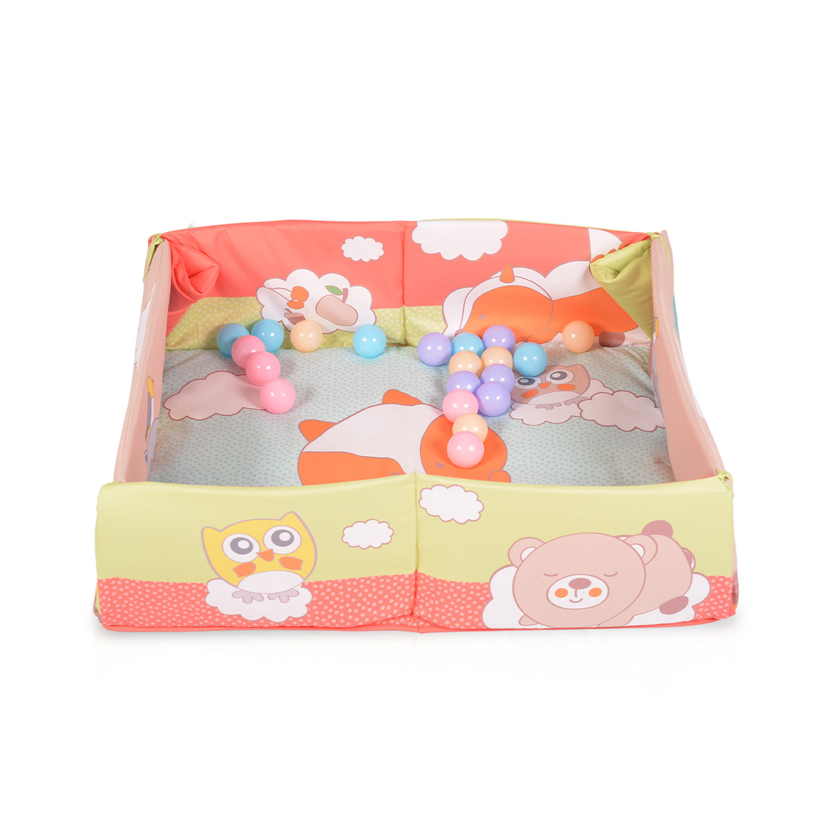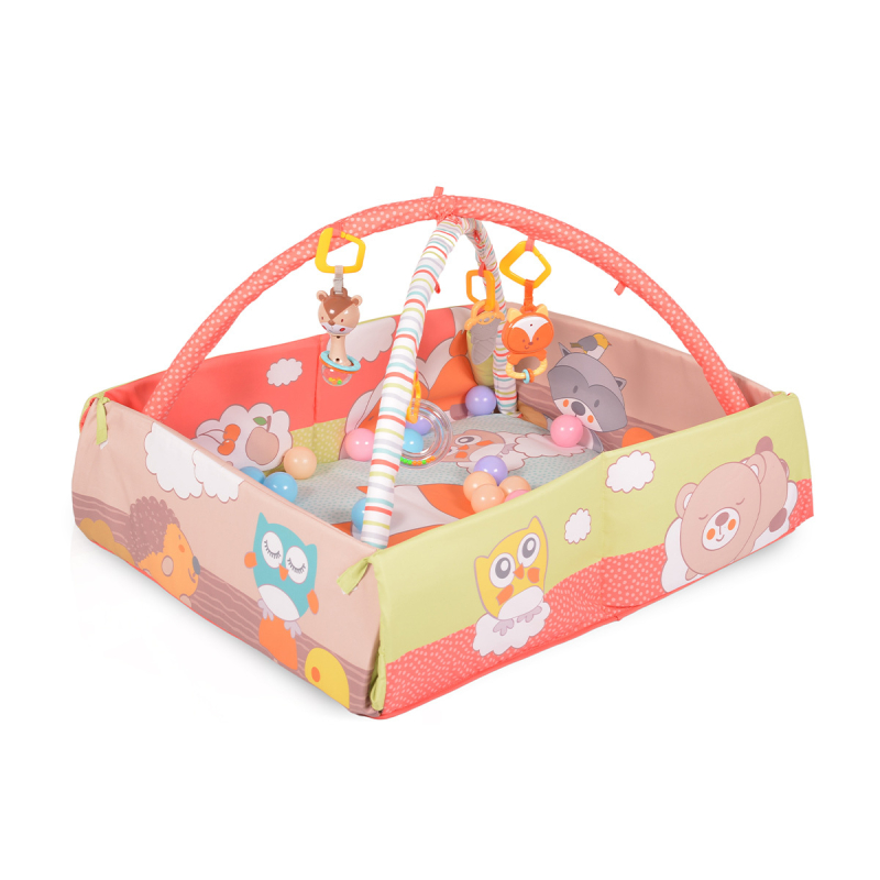 Εκπαιδευτικό γυμναστήριο σε κοραλί-πολύχρωμες αποχρώσεις από την εταιρεία Konig Kids. Σχεδιασμένο για να μπορεί να παίζει το μωρό ξαπλωμένο, μπρούμυτα ή καθιστό προσφέροντάς του διασκέδαση σε όλα τα στάδια ανάπτυξης. Διαθέτει αποσπώμενα κρεμαστά παιχνίδια και 20 μπαλίτσες για ατελείωτο παιχνίδι. Οι 4 εξωτερικές πλευρές του ανασηκώνονται δημιουργώντας έτσι έναν προστατευμένο χώρο παιχνιδιού για το μικρό σας. Αφαιρώντας τους 2 άξονες, μπορείτε να το χρησιμοποιήσετε σαν μαλακό χαλάκι παιχνιδιού. Μέσω του παιχνιδιού στο γυμναστήριο, το μωρό σας αναπτύσσει την αντίληψή του, τις κινητικές του ικανότητες και ταυτόχρονα μαθαίνει τα σχήματα και τα χρώματα. Κατασκευασμένο από μη τοξικό πλαστικό, με υφάσματα από 100% Polyester. Κατάλληλο από την γέννηση.