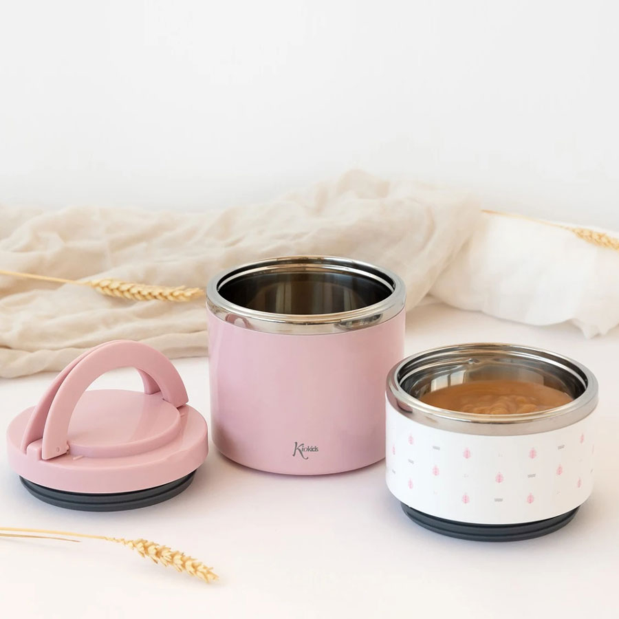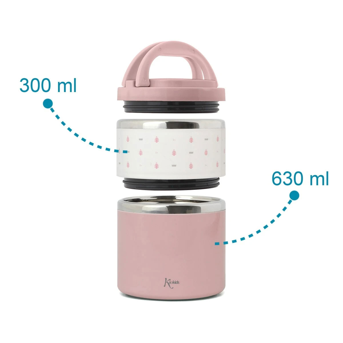 Βρεφικό θερμός φαγητού χωρητικότητας 930ml από την εταιρεία Kiokids σε ροζ χρώμα. Είναι κατασκευασμένο από ανοξείδωτο ατσάλι 304 υψηλής ποιότητας, ασφαλές για τρόφιμα, ανθεκτικό στη φθορά και στη σκουριά. Με διπλό αποθηκευτικό χώρο 300ml & 630ml, μπορείτε να διαχωρίσετε διαφορετικά είδη φαγητού. Με αεροστεγές καπάκι σιλικόνης εμποδίζοντας διαρροές ενώ διατηρεί τη φρεσκάδα των τροφών. Διατηρεί την θερμοκρασία του φαγητού έως 4 ώρες ανάλογα με τη θερμοκρασία του φαγητού και τις εξωτερικές συνθήκες. Για ακόμα καλύτερη απόδοση θερμομόνωσης, γεμίστε το θερμοδοχείο με καυτό ή παγωμένο νερό για λίγα λεπτά πριν τη χρήση. Ιδανικό για ηλικίες 0+ μηνών. Δεν είναι κατάλληλο για φούρνο μικροκυμάτων. Κατάλληλο για πλυντήριο πιάτων μόνο στην επάνω σχάρα.
