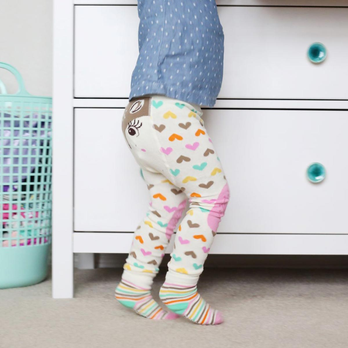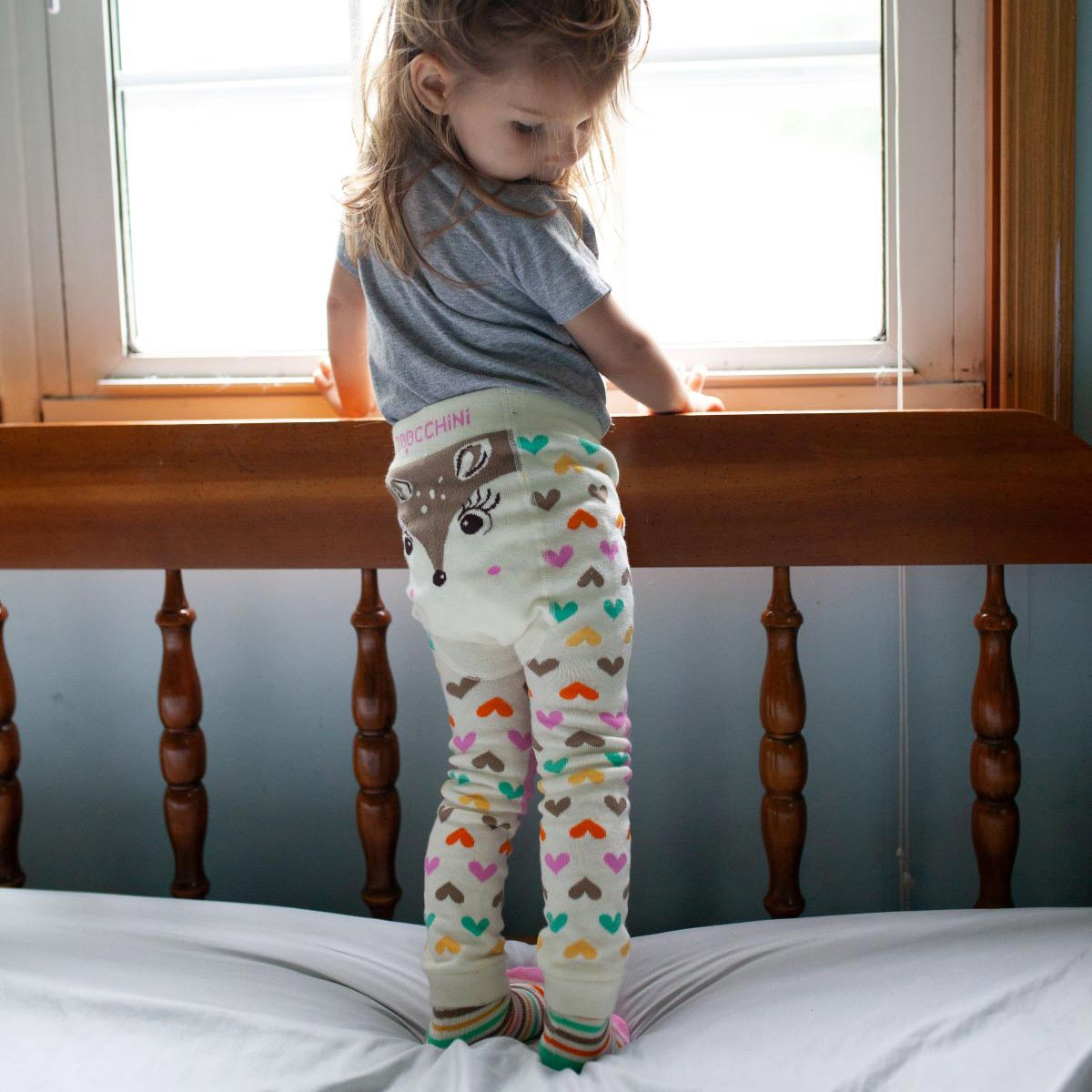 Βρεφικό κολάν και βρεφικά καλτσάκια σε λευκό χρώμα, πολύχρωμες λεπτομέρειες και σχέδιο ελαφάκι από την εταιρία Zoocchini. Είναι κατασκευασμένα από βαμβάκι-πολυαμίδιο και spandex για μεγαλύτερη άνεση και ελαστικότητα. Το κολάν είναι ιδανικό για το μπουσούλημα του μικρού σας, καθώς είναι ειδικά σχεδιασμένο για να προστατεύει τα γονατάκια από μελανιές και χτυπήματα χάρη στα σχέδια σιλικόνης που διαθέτει. Τα συγκεκριμένα σχέδια δημιουργούν αντίσταση, συμβάλλουν στην εκγύμναση του σώματος και βοηθούν το μικρό σας να σπρώξει μπροστά χωρίς να γλιστράει. Το κολάν είναι αρκετά μαλακό, με ύφασμα που αναπνέει για να μην ερεθίζεται το δέρμα του μικρού σας. Η μέση είναι ελαστική, χωρίς κουμπιά ή ζώνες και στον αστράγαλο το κράτημα είναι ελαστικό. Το πίσω μέρος του κολάν είναι ευρύχωρο για να μπορεί να φορεθεί και με την πάνα. Το σετ διαθέτει επιπλέον και ένα ζευγάρι κάλτσες, που και αυτές διαθέτουν αντιολισθητικά βεντουζάκια στο κάτω μέρος για να περπατάει και να παίζει με ασφάλεια το μωράκι σας. Ιδανικό σετ που μπορεί να φορεθεί όλον τον χρόνο, ενώ θα εξασφαλίσουν άνεση και ασφάλεια για την μετάβαση του μωρού σας από το μπουσούλημα στο περπάτημα. Το κολάν απο 6 έως 12 μηνών είναι κατάλληλο για 6.5-10 κιλά, 66-76εκ. Ύψος, 38εκ. Μήκος από την μέση έως τον αστράγαλο και 17.5-30εκ. μέση. Από 12-18 μηνών είναι κατάλληλο για 10-14 κιλά, 73-83εκ. Ύψος, 43εκ. Μήκος από την μέση έως τον αστράγαλο και 18-33εκ. μέση.