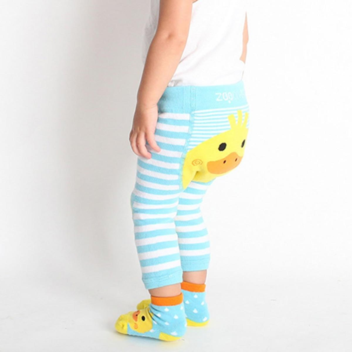 Βρεφικό κολάν και βρεφικά καλτσάκια σε γαλάζιο-κίτρινο χρώμα και σχέδιο παπάκι από την εταιρία Zoocchini. Είναι κατασκευασμένα από βαμβάκι-πολυαμίδιο και spandex για μεγαλύτερη άνεση και ελαστικότητα. Το κολάν είναι ιδανικό για το μπουσούλημα του μικρού σας, καθώς είναι ειδικά σχεδιασμένο για να προστατεύει τα γονατάκια από μελανιές και χτυπήματα χάρη στα σχέδια σιλικόνης που διαθέτει. Τα συγκεκριμένα σχέδια δημιουργούν αντίσταση, συμβάλλουν στην εκγύμναση του σώματος και βοηθούν το μικρό σας να σπρώξει μπροστά χωρίς να γλιστράει. Το κολάν είναι αρκετά μαλακό, με ύφασμα που αναπνέει για να μην ερεθίζεται το δέρμα του μικρού σας. Η μέση είναι ελαστική, χωρίς κουμπιά ή ζώνες και στον αστράγαλο το κράτημα είναι ελαστικό. Το πίσω μέρος του κολάν είναι ευρύχωρο για να μπορεί να φορεθεί και με την πάνα. Το σετ διαθέτει επιπλέον και ένα ζευγάρι κάλτσες, που και αυτές διαθέτουν αντιολισθητικά βεντουζάκια στο κάτω μέρος για να περπατάει και να παίζει με ασφάλεια το μωράκι σας. Ιδανικό σετ που μπορεί να φορεθεί όλον τον χρόνο, ενώ θα εξασφαλίσουν άνεση και ασφάλεια για την μετάβαση του μωρού σας από το μπουσούλημα στο περπάτημα. Το κολάν απο 6 έως 12 μηνών είναι κατάλληλο για 6.5-10 κιλά, 66-76εκ. Ύψος, 38εκ. Μήκος από την μέση έως τον αστράγαλο και 17.5-30εκ. μέση. Από 12-18 μηνών είναι κατάλληλο για 10-14 κιλά, 73-83εκ. Ύψος, 43εκ. Μήκος από την μέση έως τον αστράγαλο και 18-33εκ. μέση.