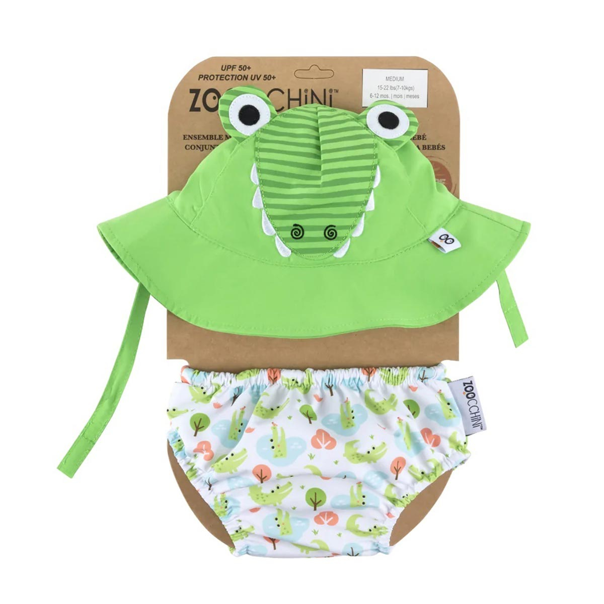 Βρεφικό σετ μαγιό-πάνα και καπέλο με αντιηλιακή προστασία από την εταιρία Zoocchini. Το καπέλο έχει πράσινο χρώμα και σχέδιο αλιγάτορα, ενώ το μαγιό έχει λευκό φόντο, πράσινες-μπλε λεπτομέρειες και σχέδιο ζωάκια. Είναι κατασκευασμένα από microfiber και polyester, ενώ έχουν πιστοποιημένη προστασία UPF50+ που προστατεύει το μικρό σας από τις βλαβερές ακτίνες του ηλίου. Η αντιηλιακή προστασία προέρχεται από το νήμα του υφάσματος και δεν περιέχει ψευδάργυρο ή άλλα χημικά. Το μαγιό-πάνα είναι η ιδανική λύση για την παραλία ή την πισίνα, καθώς το ύφασμά του είναι απαλό και άνετο, ειδικά σχεδιασμένο για να αποτρέπει τις διαρροές. Διαθέτει ρύθμιση στην μέση για να εξασφαλίζει τέλεια εφαρμογή, χωρίς ιμάντες, κουμπιά ή οτιδήποτε άλλο θα μπορούσε να ερεθίσει το δέρμα του μικρού σας. Είναι επαναχρησιμοποιούμενο και πλένεται εύκολα. Το σετ αυτό αποτελεί ιδανική λύση για την παραλία ή την πισίνα καθώς, είναι ανθεκτικό σε αλάτι και χλώριο, το μαγιό είναι σχεδιασμένο να πλυθεί αρκετές φορές και το καπέλο προστατεύει το μικρό σας από τον ήλιο. Το σετ διατίθεται σε 6 έως 12 μηνών κατάλληλο για 7-10 κιλά και 50εκ. διάμετρο κεφαλιού και σε 12 έως 24 μηνών κατάλληλο για 10-13 κιλά και 53εκ. διάμετρο κεφαλιού.