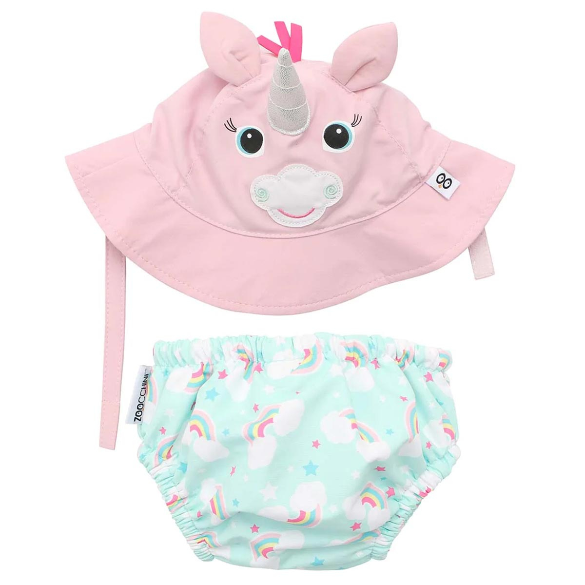 Βρεφικό σετ μαγιό-πάνα και καπέλο με αντιηλιακή προστασία από την εταιρία Zoocchini. Το καπέλο έχει ροζ χρώμα και σχέδιο μονόκερο, ενώ το μαγιό έχει γαλάζιο φόντο, πολύχρωμες λεπτομέρειες και μοντέρνο σχέδιο. Είναι κατασκευασμένα από microfiber και polyester, ενώ έχουν πιστοποιημένη προστασία UPF50+ που προστατεύει το μικρό σας από τις βλαβερές ακτίνες του ηλίου. Η αντιηλιακή προστασία προέρχεται από το νήμα του υφάσματος και δεν περιέχει ψευδάργυρο ή άλλα χημικά. Το μαγιό-πάνα είναι η ιδανική λύση για την παραλία ή την πισίνα, καθώς το ύφασμά του είναι απαλό και άνετο, ειδικά σχεδιασμένο για να αποτρέπει τις διαρροές. Διαθέτει ρύθμιση στην μέση για να εξασφαλίζει τέλεια εφαρμογή, χωρίς ιμάντες, κουμπιά ή οτιδήποτε άλλο θα μπορούσε να ερεθίσει το δέρμα του μικρού σας. Είναι επαναχρησιμοποιούμενο και πλένεται εύκολα. Το σετ αυτό αποτελεί ιδανική λύση για την παραλία ή την πισίνα καθώς, είναι ανθεκτικό σε αλάτι και χλώριο, το μαγιό είναι σχεδιασμένο να πλυθεί αρκετές φορές και το καπέλο προστατεύει το μικρό σας από τον ήλιο. Το σετ διατίθεται σε 6 έως 12 μηνών κατάλληλο για 7-10 κιλά και 50εκ. διάμετρο κεφαλιού και σε 12 έως 24 μηνών κατάλληλο για 10-13 κιλά και 53εκ. διάμετρο κεφαλιού.