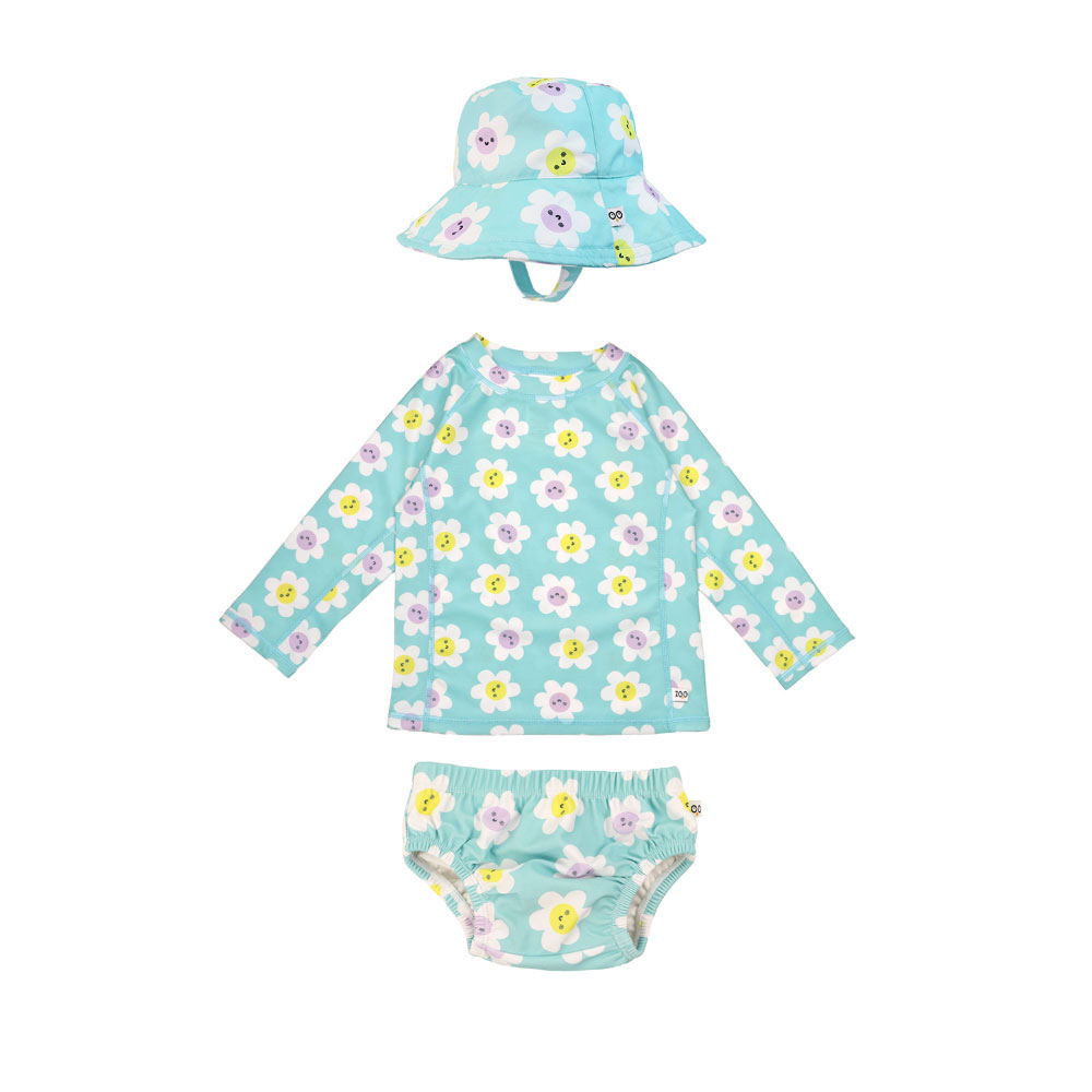 Σετ μπλούζα, μαγιό-πάνα και καπέλο με πιστοποιημένη αντιηλιακή προστασία από την εταιρία Zoocchini. Έχουν γαλάζιο χρώμα, με κίτρινες-λευκές λεπτομέρειες και φλοράλ σχέδιο. Είναι κατασκευασμένα από polyester-spandex που διατηρεί το σχήμα του ακόμη και όταν είναι βρεγμένο ενώ η αντιηλιακή προστασία προέρχεται από το νήμα του υφάσματος απαλλαγμένο από ψευδάργυρο και άλλες τοξικές ουσίες. Το μαγιό-πάνα έχει αδιάβροχη εσωτερική επένδυση για να αποτρέψει λεκέδες και διαρροές και είναι επαναχρησιμοποιούμενο. Επίσης το καπέλο διαθέτει λουρί για να μένει σταθερό. Το σετ αυτό αποτελεί ιδανική λύση για την παραλία ή την πισίνα καθώς, είναι ανθεκτικό σε αλάτι και χλώριο, το μαγιό είναι σχεδιασμένο να πλυθεί αρκετές φορές και το καπέλο προστατεύει το μικρό σας από τον ήλιο. Διατίθεται σε 6- 12 μηνών, 12-24 μηνών.