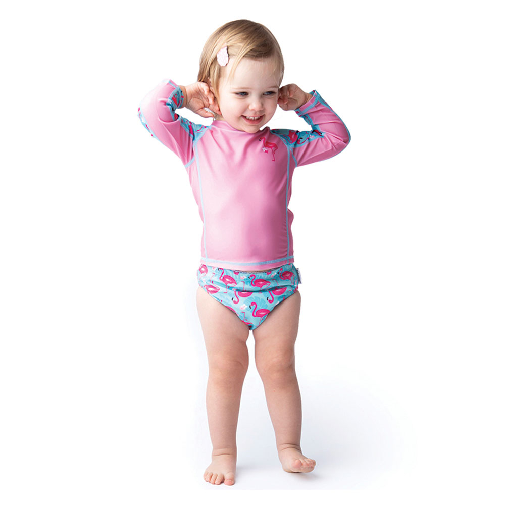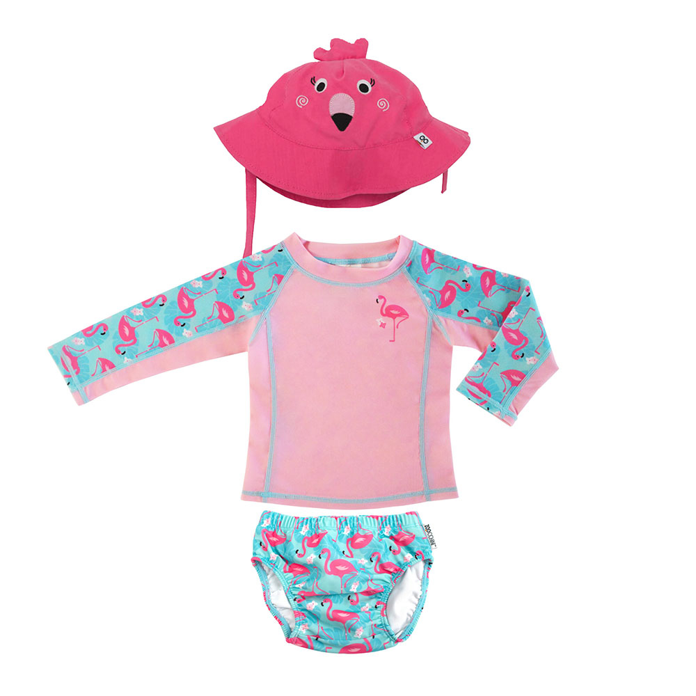 Βρεφικό μαγιό σετ από την εταιρεία Zoocchini σε ροζ χρώμα με γαλάζιες λεπτομέρειες και φλαμίνγκο στο σχέδιο. Είναι κατασκευασμένο από πολυεστέρα και spandex. Η αντιηλιακή προστασία UPF50+ προέρχεται από το νήμα του υφάσματος απαλλαγμένο από ψευδάργυρο και άλλες τοξικές ουσίες. Έχουν αδιάβροχη εσωτερική επένδυση για να αποτρέψουν λεκέδες και διαρροές. Διαθέτουν λάστιχο στην μέση για να εξασφαλίζουν τέλεια εφαρμογή, χωρίς ιμάντες, κουμπιά ή οτιδήποτε άλλο θα μπορούσε να ερεθίσει το δέρμα του μικρού σας. Είναι επαναχρησιμοποιούμενα, πλένονται εύκολα και είναι ιδανικά για την θάλασσα ή την πισίνα, καθώς αντέχουν στο χλώριο και στο θαλασσινό νερό. Το σετ αποτελείται από το μαγιό-πάνα, το καπέλο και την μπλούζα. Ένα ολοκληρωμένο σετ για κάθε βρέφος. Διατίθεται σε 6-12 μηνών: μπλουζάκι 68-79εκ., κατάλληλο για 7-10 κιλά με περίμετρο στήθους 24εκ., καπέλο: διάμετρος 50εκ. και μαγιό-πάνα κατάλληλο για 16.8-10 κιλά με διάμετρο μέσης 18-25.4εκ. Σε 12-24 μηνών: μπλουζάκι 78-94εκ., κατάλληλο για 10-13 κιλά με περίμετρο στήθους 24εκ., καπέλο: διάμετρος 53.5εκ. και μαγιό-πάνα κατάλληλο για 10-13.6 κιλά με διάμετρο μέσης 18-25.4εκ.