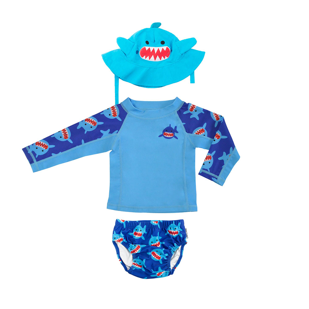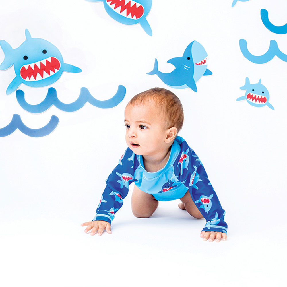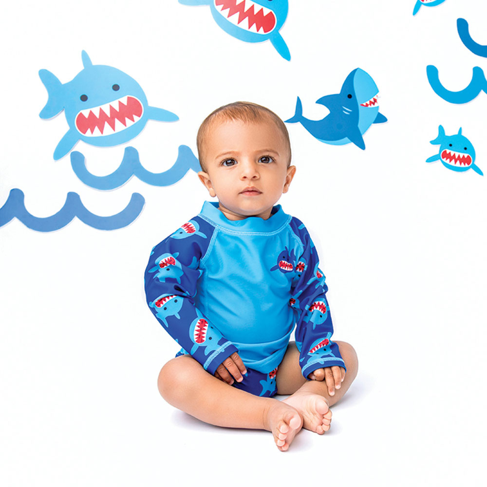 Βρεφικό μαγιό σετ από την εταιρεία Zoocchini σε γαλάζιο-μπλε χρώμα με καρχαρία στο σχέδιο. Είναι κατασκευασμένο από πολυεστέρα και spandex. Η αντιηλιακή προστασία UPF50+ προέρχεται από το νήμα του υφάσματος απαλλαγμένο από ψευδάργυρο και άλλες τοξικές ουσίες. Έχουν αδιάβροχη εσωτερική επένδυση για να αποτρέψουν λεκέδες και διαρροές. Διαθέτουν λάστιχο στην μέση για να εξασφαλίζουν τέλεια εφαρμογή, χωρίς ιμάντες, κουμπιά ή οτιδήποτε άλλο θα μπορούσε να ερεθίσει το δέρμα του μικρού σας. Είναι επαναχρησιμοποιούμενα, πλένονται εύκολα και είναι ιδανικά για την θάλασσα ή την πισίνα, καθώς αντέχουν στο χλώριο και στο θαλασσινό νερό. Το σετ αποτελείται από το μαγιό-πάνα, το καπέλο και την μπλούζα. Ένα ολοκληρωμένο σετ για κάθε βρέφος. Διατίθεται σε 6-12 μηνών: μπλουζάκι 68-79εκ., κατάλληλο για 7-10 κιλά με περίμετρο στήθους 24εκ., καπέλο: διάμετρος 50εκ. και μαγιό-πάνα κατάλληλο για 16.8-10 κιλά με διάμετρο μέσης 18-25.4εκ. Σε 12-24 μηνών: μπλουζάκι 78-94εκ., κατάλληλο για 10-13 κιλά με περίμετρο στήθους 24εκ., καπέλο: διάμετρος 53.5εκ. και μαγιό-πάνα κατάλληλο για 10-13.6 κιλά με διάμετρο μέσης 18-25.4εκ.