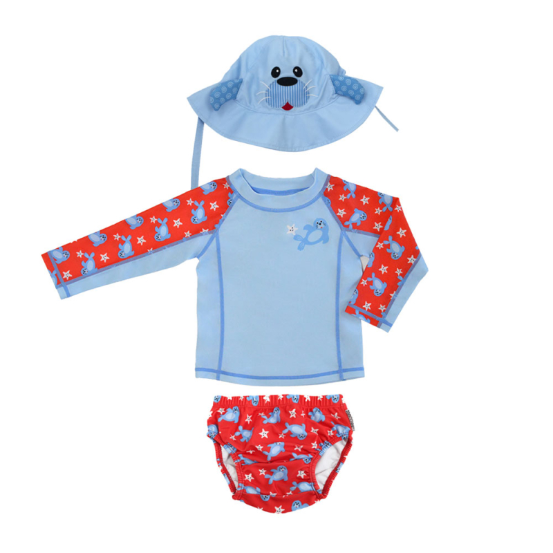Βρεφικό μαγιό σετ από την εταιρεία Zoocchini γαλάζιο χρώμα με κόκκινες λεπτομέρειες και φώκια στο σχέδιο. Είναι κατασκευασμένο από πολυεστέρα και spandex. Η αντιηλιακή προστασία UPF50+ προέρχεται από το νήμα του υφάσματος απαλλαγμένο από ψευδάργυρο και άλλες τοξικές ουσίες. Έχουν αδιάβροχη εσωτερική επένδυση για να αποτρέψουν λεκέδες και διαρροές. Διαθέτουν λάστιχο στην μέση για να εξασφαλίζουν τέλεια εφαρμογή, χωρίς ιμάντες, κουμπιά ή οτιδήποτε άλλο θα μπορούσε να ερεθίσει το δέρμα του μικρού σας. Είναι επαναχρησιμοποιούμενα, πλένονται εύκολα και είναι ιδανικά για την θάλασσα ή την πισίνα, καθώς αντέχουν στο χλώριο και στο θαλασσινό νερό. Το σετ αποτελείται από το μαγιό-πάνα, το καπέλο και την μπλούζα. Ένα ολοκληρωμένο σετ για κάθε βρέφος. Διατίθεται σε 6-12 μηνών: μπλουζάκι 68-79εκ., κατάλληλο για 7-10 κιλά με περίμετρο στήθους 24εκ., καπέλο: διάμετρος 50εκ. και μαγιό-πάνα κατάλληλο για 16.8-10 κιλά με διάμετρο μέσης 18-25.4εκ. Σε 12-24 μηνών: μπλουζάκι 78-94εκ., κατάλληλο για 10-13 κιλά με περίμετρο στήθους 24εκ., καπέλο: διάμετρος 53.5εκ. και μαγιό-πάνα κατάλληλο για 10-13.6 κιλά με διάμετρο μέσης 18-25.4εκ.