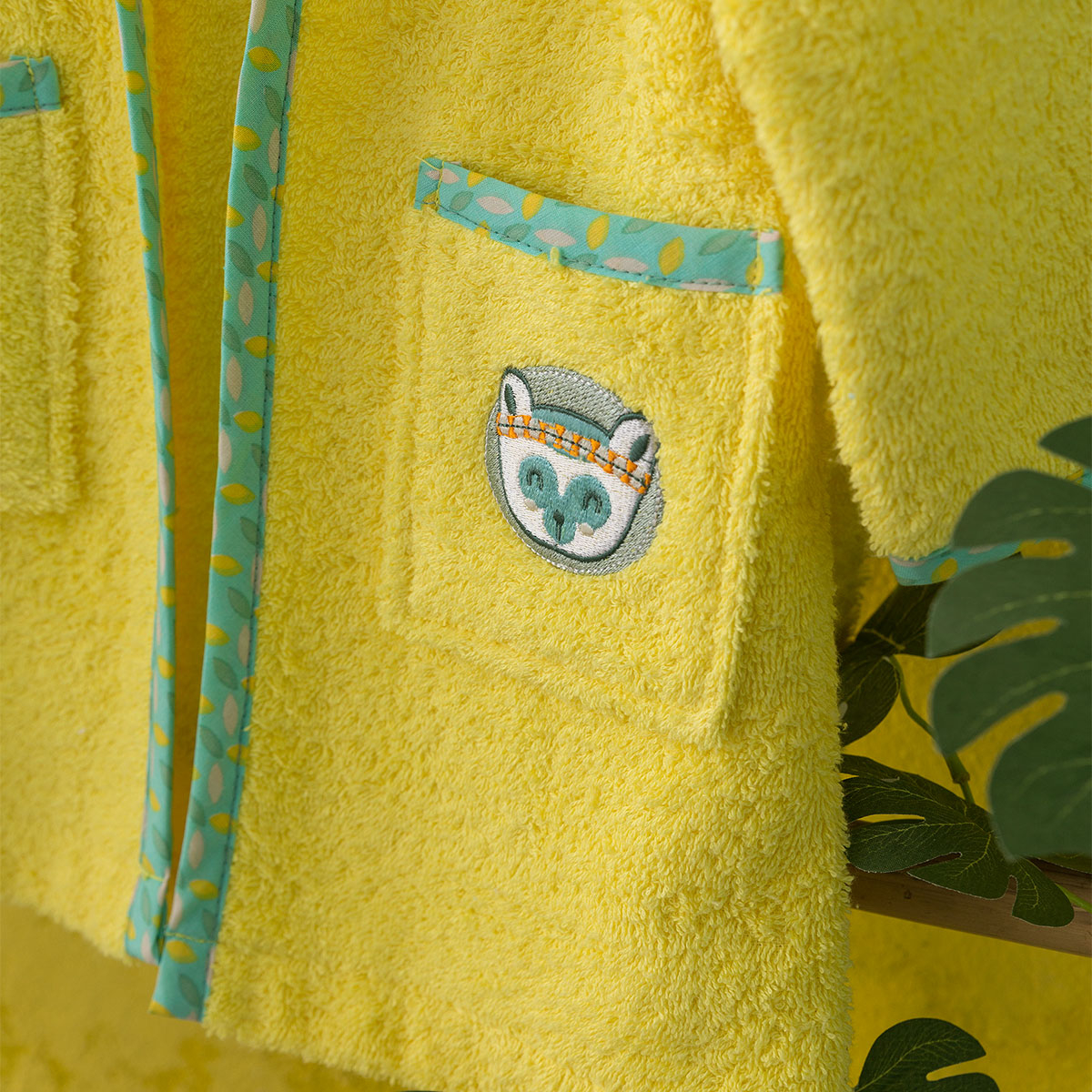 Βρεφικό μπουρνούζι για το μπάνιο του μωρού από την εταιρεία Nima με σχέδιο ζωάκια. Είναι 100% βαμβακερό σε κίτρινο χρώμα με κεντητό σχέδιο στο στήθος και περιμετρικό υφασμάτινο ρέλι σε βεραμάν χρώμα. Διαθέτει κουκούλα, τσέπες και ζώνη. Διατίθεται σε συσκευασία κουτί.