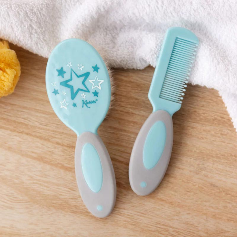 Σετ περιποίησης μαλλιών σε γαλάζιο-γκρι χρώμα και σχέδιο καρδούλες από την εταιρία Kiokids. Το σετ αποτελείται από μια χτένα και μία βούρτσα, κατασκευασμένα από πλαστικό. Οι τρίχες της βούρτσας είναι φυσικές και μαλακές. Ιδανικό σετ για να περιποιηθείτε τα μαλάκια του μωρού σας. Κατάλληλο για ηλικίες από 0+ μηνών.