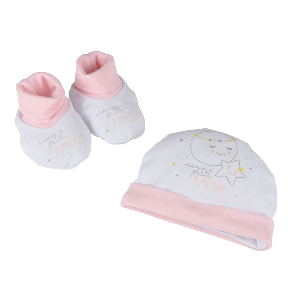Βρεφικό σετ για νεογέννητο σε λευκό χρώμα με ροζ λεπτομέρειες και σχέδιο παιδικές φιγούρες. Το σετ αποτελείται από βρεφικά καλτσάκια και σκουφάκι κατάλληλα για βρέφη από 0 έως 1 μηνών. Κατασκευασμένα από 100% βαμβάκι που τα καθιστά εξαιρετικά απαλά και ανθεκτικά. Το σετ διατίθεται σε πουγκί.