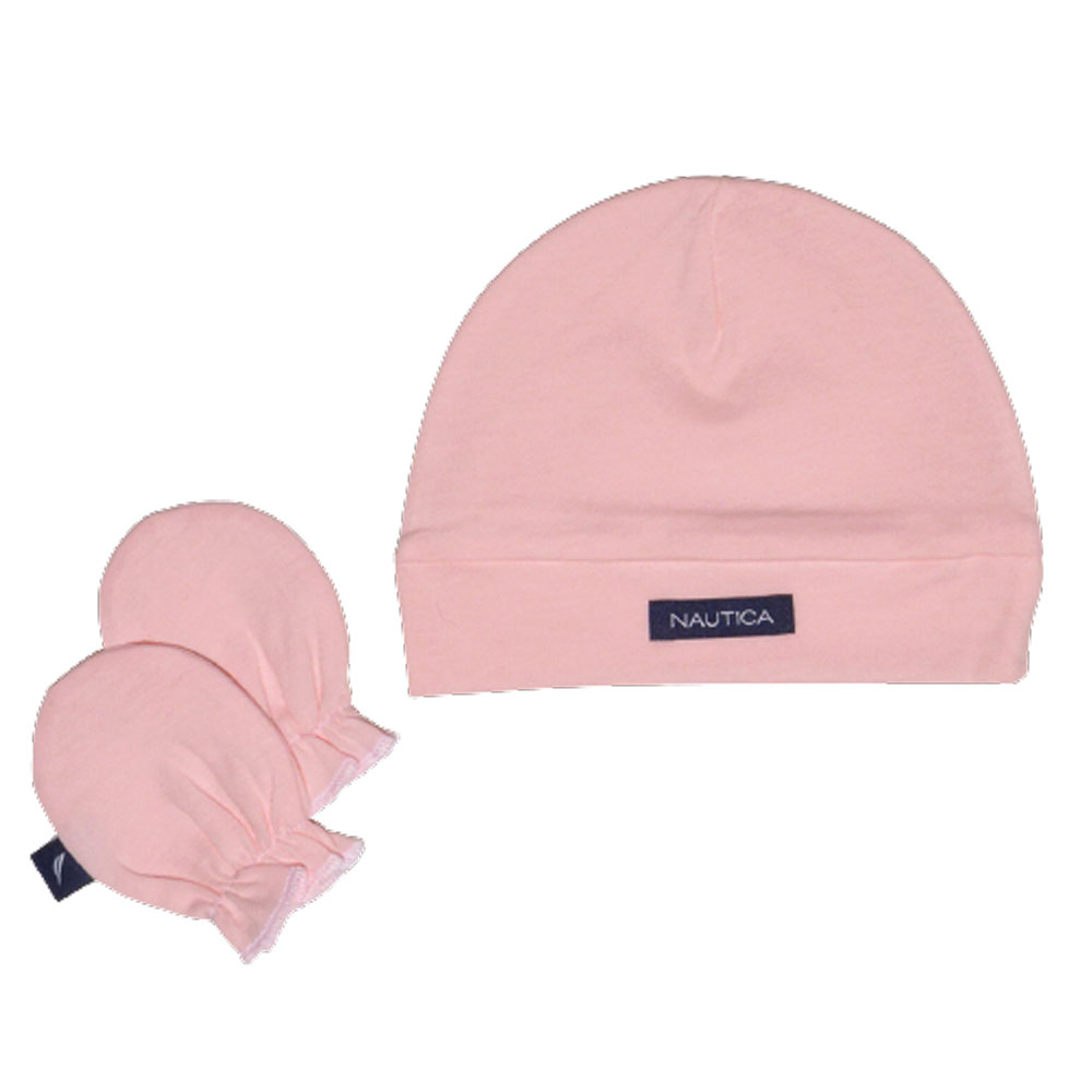 Βρεφικό σετ για νεογέννητο από την εταιρεία Nautica. Είναι μονόχρωμα σε σομόν χρώμα με λευκή λεπτομέρεια. Το ύφασμά τους είναι Jersey από 100% βαμβάκι πενιέ με πιστοποίηση Oekotex που εγγυάται ότι τα υφάσματα δεν έχουν επιβλαβείς ουσίες. Το σετ αποτελείται από βρεφικά γαντάκια και σκουφάκι κατάλληλα για βρέφη από 0 έως 1 μηνών. Σε συσκευασία σακούλα.