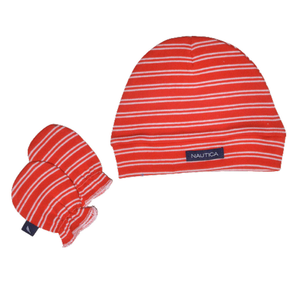 Βρεφικό σετ για νεογέννητο από την εταιρεία Nautica. Είναι σε κόκκινο χρώμα με λευκό ριγέ σχέδιο. Το ύφασμά τους είναι Jersey από 100% οργανικό βαμβάκι πενιέ με πιστοποίηση Oekotex που εγγυάται ότι τα υφάσματα δεν έχουν επιβλαβείς. πολυεστέρας. Το σετ αποτελείται από βρεφικά γαντάκια και σκουφάκι κατάλληλα για βρέφη από 0 έως 1 μηνών. Σε συσκευασία σακούλα.