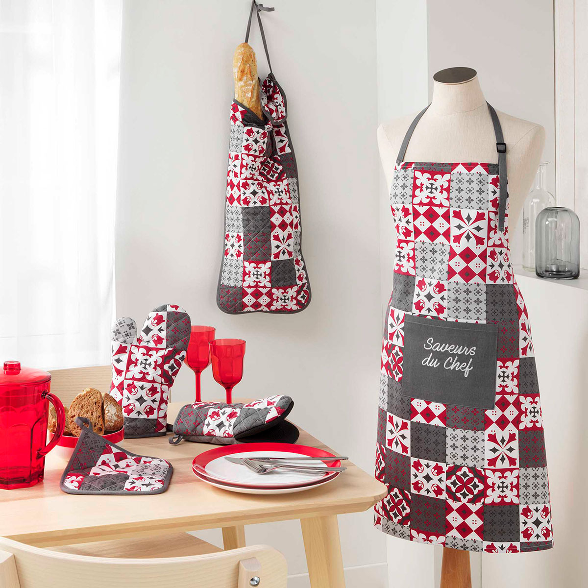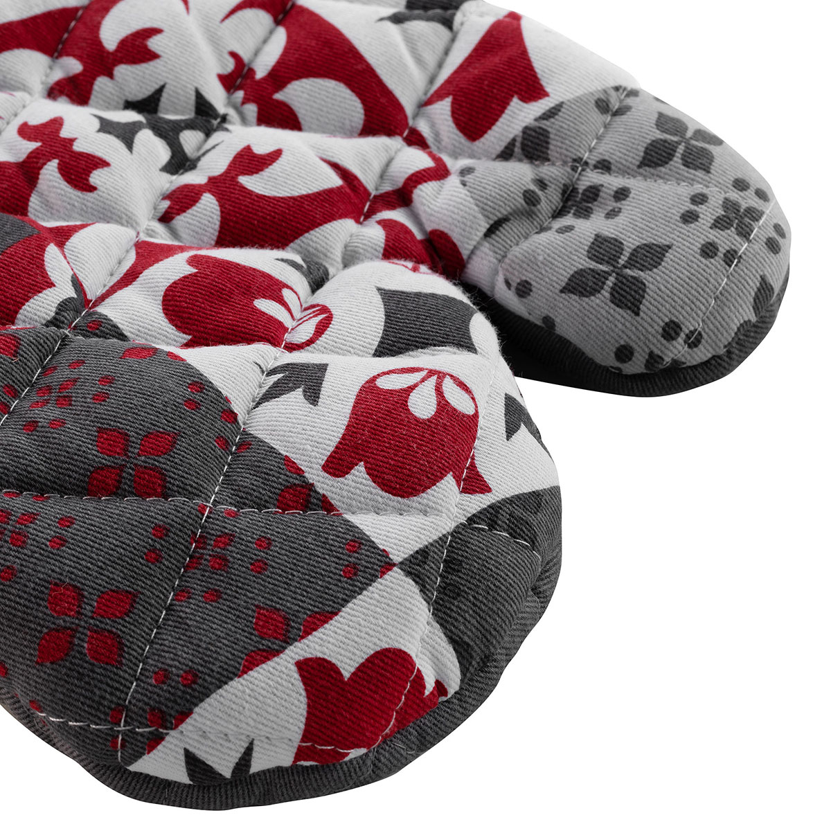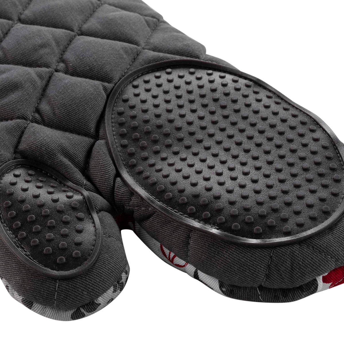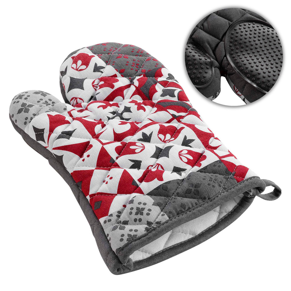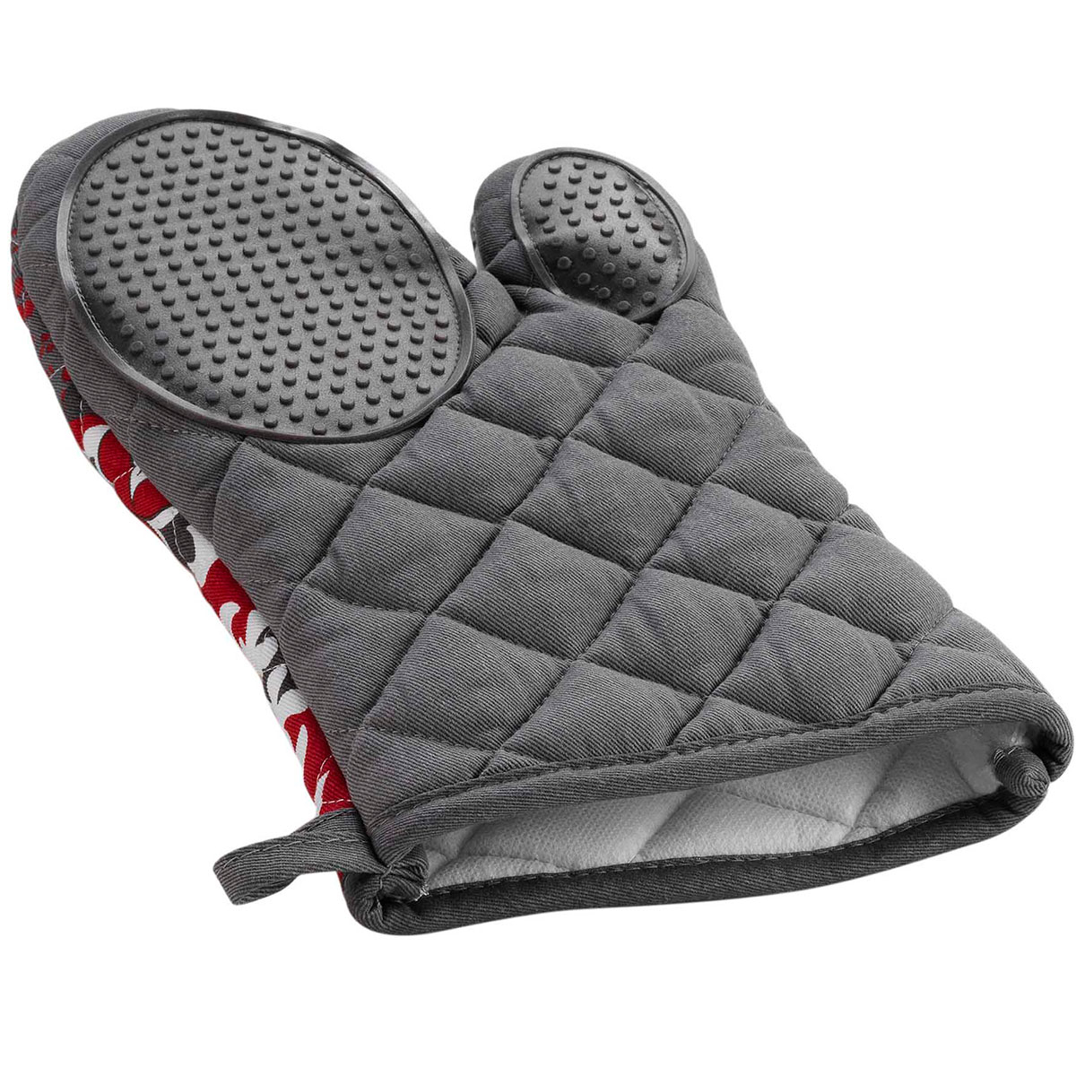 Γάντι κουζίνας σε γκρι απόχρωση μοντέρνο σχέδιο με λευκές και κόκκινες λεπτομέρειες. Το εξωτερικό ύφασμα είναι κατασκευασμένο από βαμβάκι-προπυλένιο και το γέμισμα είναι πολυεστερική βάτα. Το εσωτερικό της παλάμης διαθέτει σιλικόνη που προστατεύει από την μεταφορά θερμότητας. Ιδανικό για την αποφυγή μη επιθυμητών καψιμάτων. Συνδυάστε το με τα υπόλοιπα είδη της σειράς για ένα ολοκληρωμένο αποτέλεσμα στην κουζίνα σας.