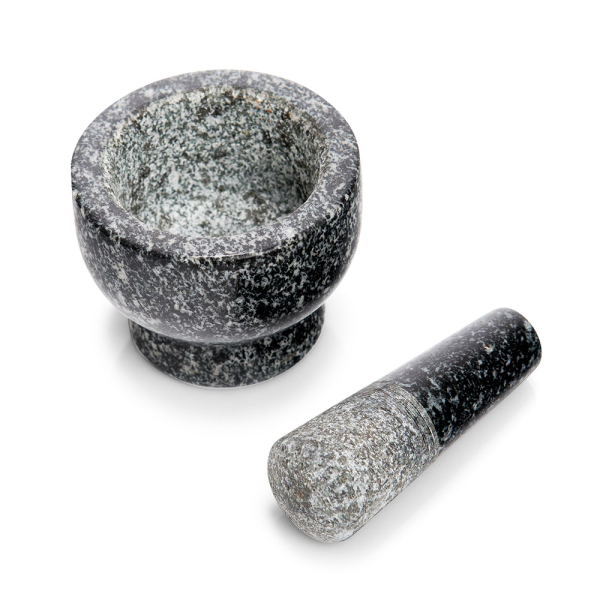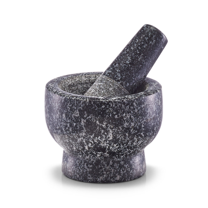 Γουδί και γουδοχέρι κουζίνας κατασκευασμένα από γρανίτη σε ανθρακί χρώμα με εφέ μαρμάρου. Ιδανικός βοηθός κουζίνας για το άλεσμα και τη σύνθλιψη φρέσκων και αποξηραμένων μπαχαρικών, βοτάνων, ξηρών καρπών και άλλων τροφίμων. Χρησιμοποιήστε το για να πολτοποιήσετε ή να αναμείξετε τα υλικά σας.