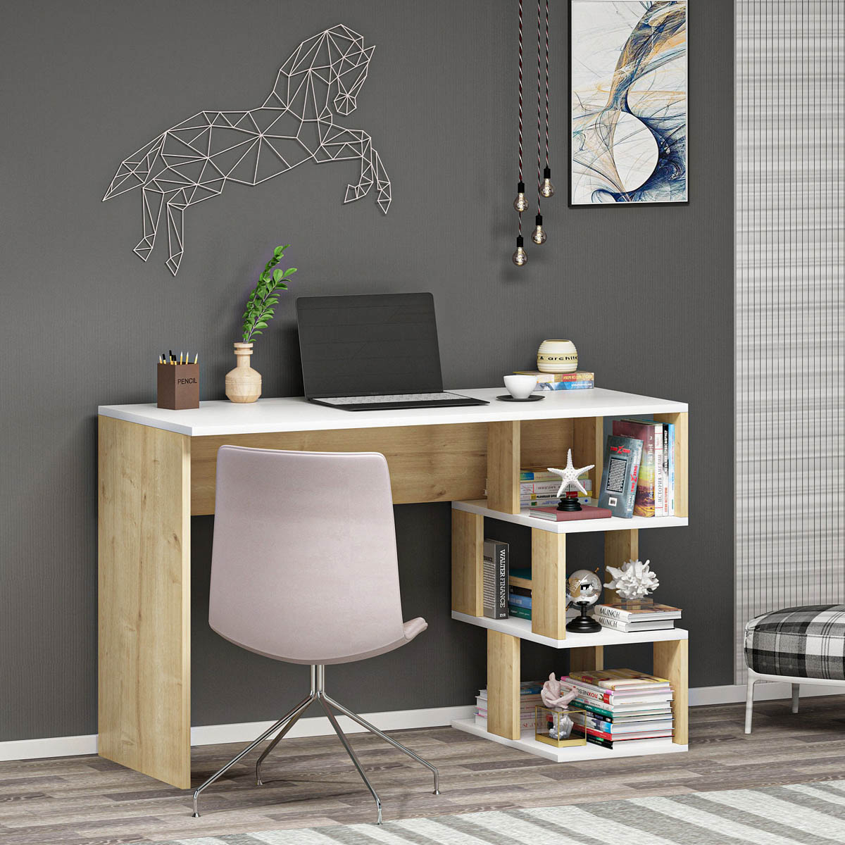 Γραφείο σε φυσικό χρώμα ξύλου και λευκό χρώμα με μοντέρνο σχεδιασμό. Είναι κατασκευασμένο από μοριοσανίδα πάχους 18mm επενδυμένη με μελαμίνη. Διαθέτει βιβλιοθήκη με 3 θέσεις για να τοποθετήσετε βιβλία και διακοσμητικά αντικείμενα. Είναι κατάλληλο και για το παιδικό ή εφηβικό δωμάτιο. Μέγιστο βάρος αντοχής: 25 kg *Το προϊόν έρχεται αμοντάριστο και συναρμολογείται βάσει οδηγιών.*