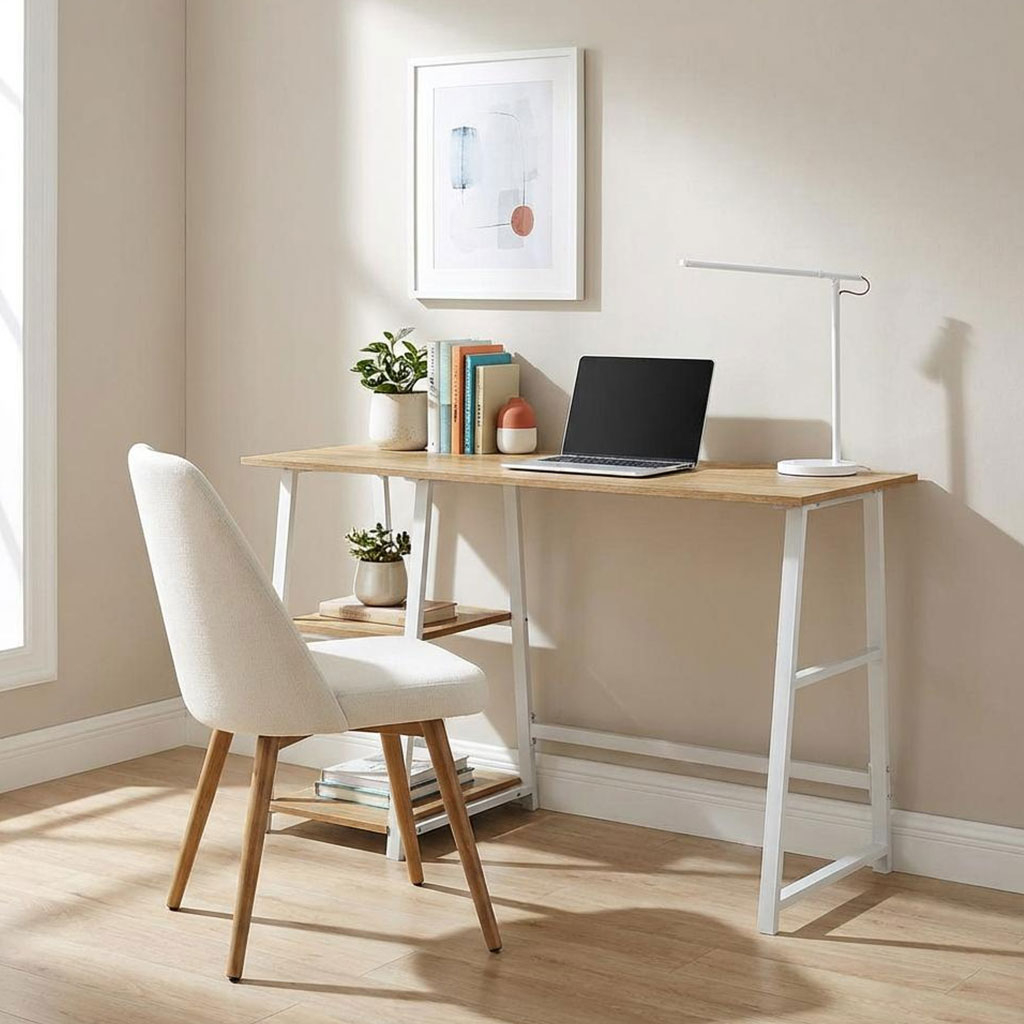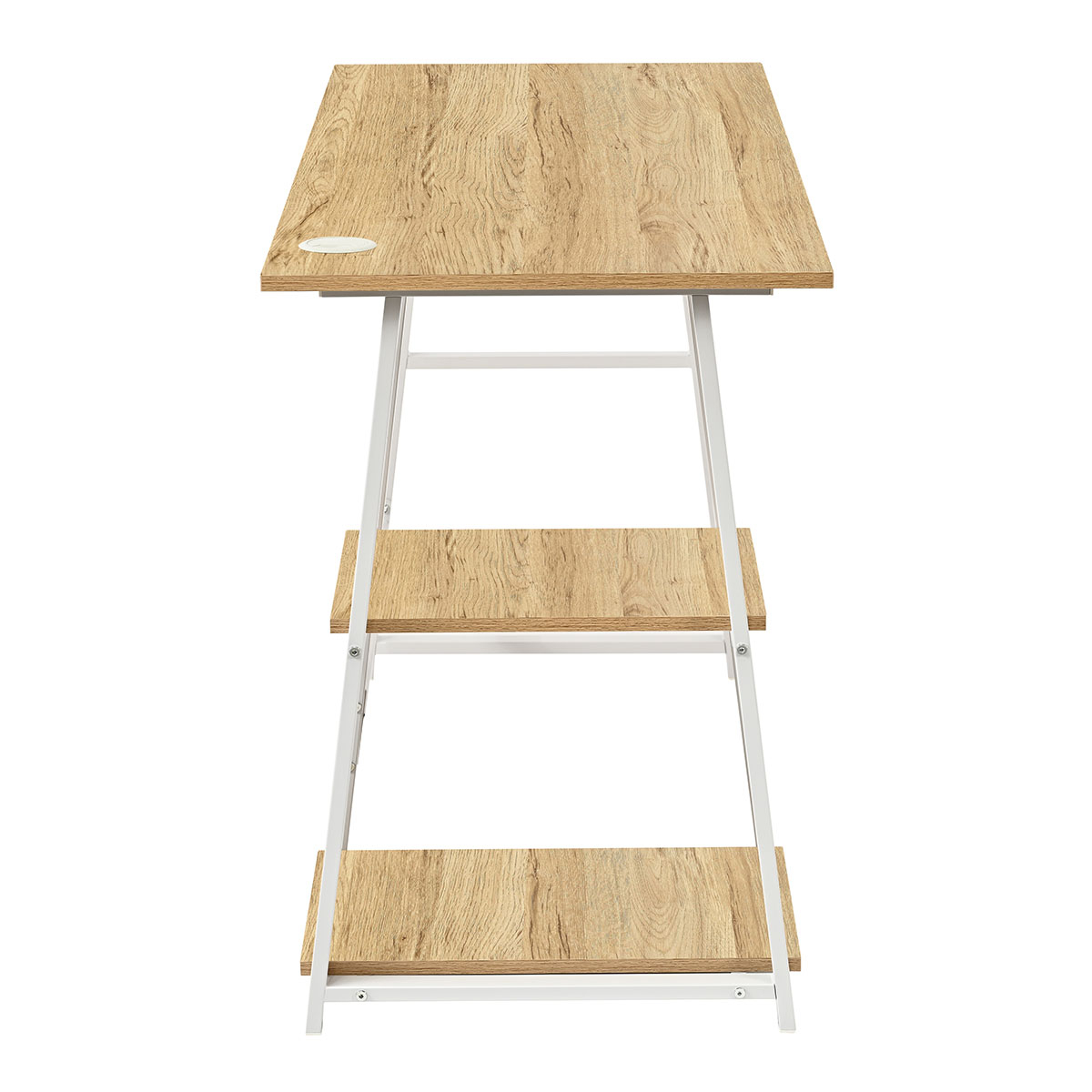 Γραφείο υπολογιστή με μοντέρνο σχεδιασμό. Η επάνω επιφάνεια είναι κατασκευασμένη από μελαμίνη πάχους 1.5cm σε απόχρωση δρυός (Oak) και έχει λευκό μεταλλικό σκελετό με ηλεκτροστατική βαφή. Διαθέτει 2 ράφια που χρησιμεύουν για βιβλία, γραφική ύλη ή ό,τι άλλο θέλετε αν έχετε κοντά στον υπολογιστή. Η επιφάνεια διαθέτει τρύπα για να περνάτε τα καλώδια. Τα πόδια του γραφείου διαθέτουν τάπες για να μην φθείρουν το πάτωμα. Συνδυάστε το με τα υπόλοιπα είδη του ίδιου σετ για ένα ολοκληρωμένο αποτέλεσμα.*Το προϊόν έρχεται αμοντάριστο και συναρμολογείται βάσει οδηγιών.*