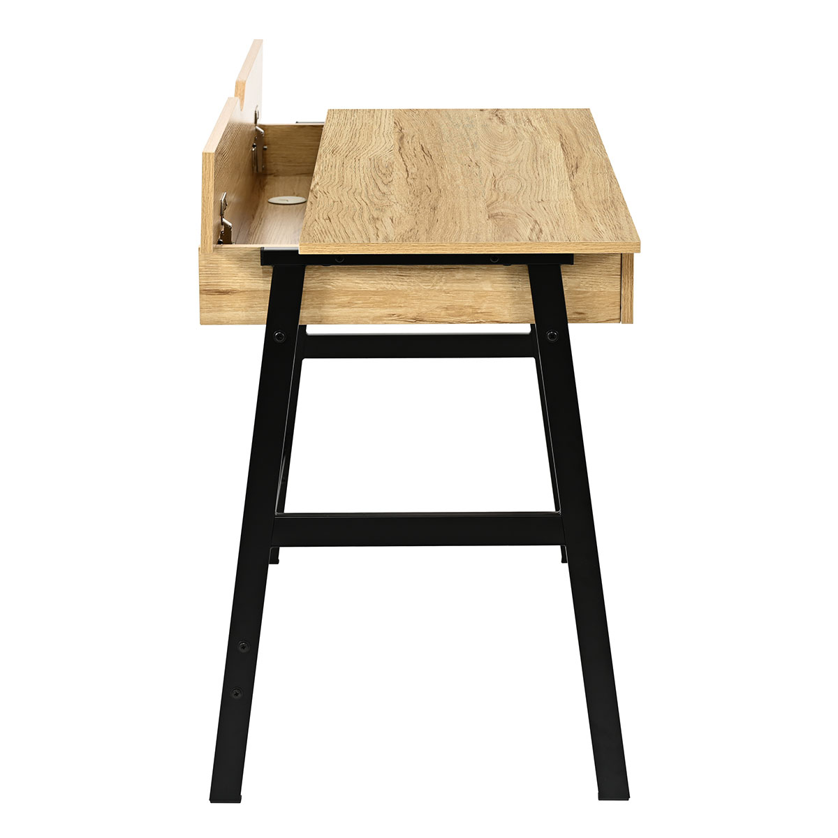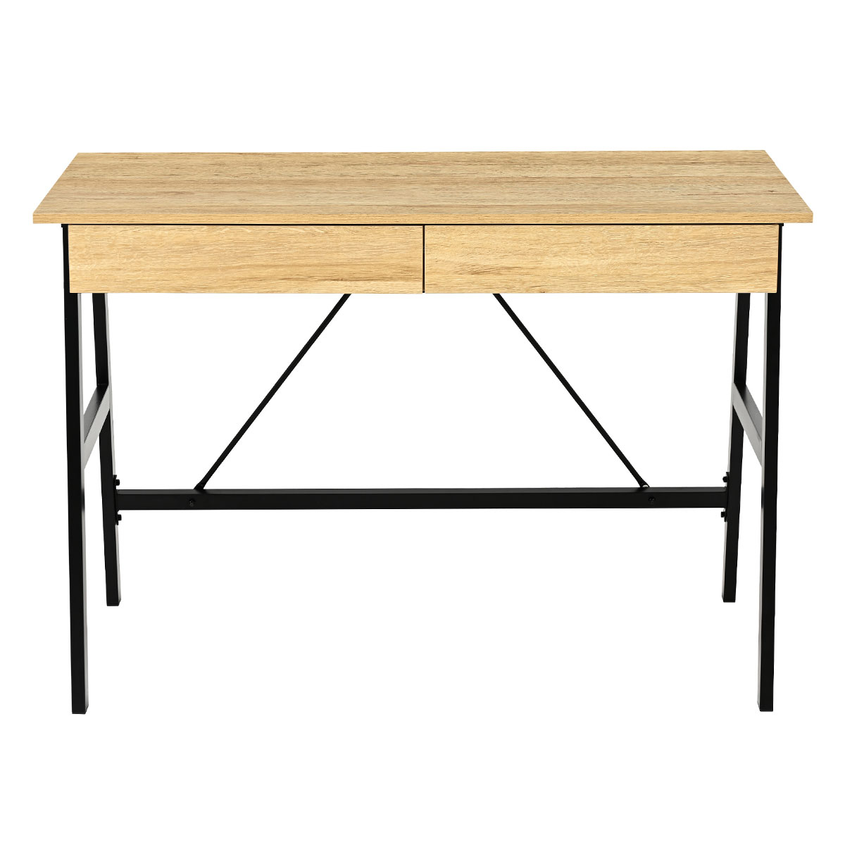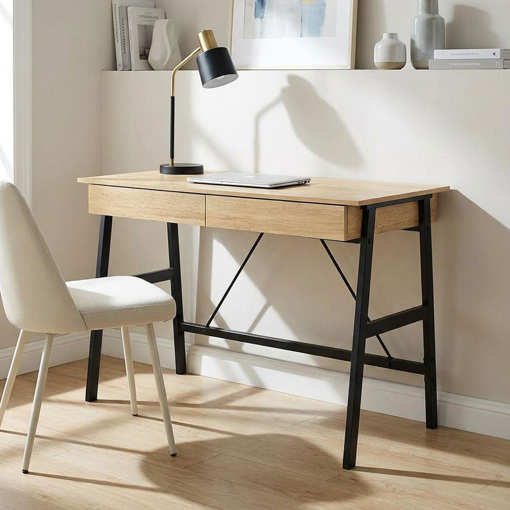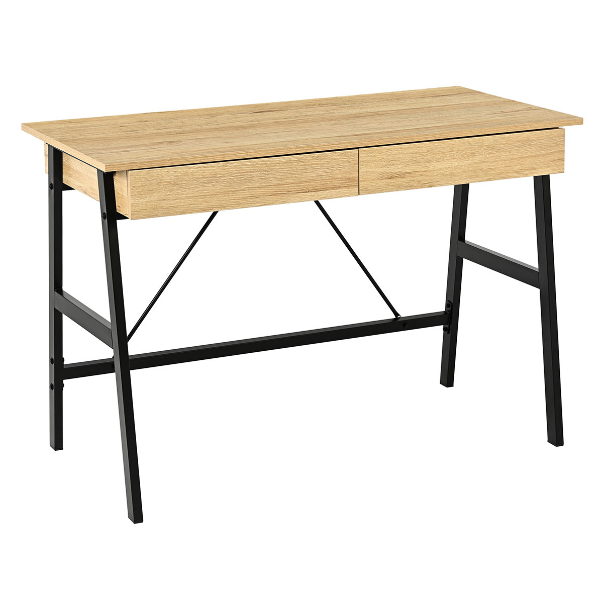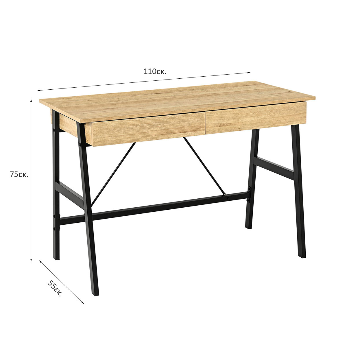 Γραφείο υπολογιστή με μίνιμαλ σχεδιασμό. Η επάνω επιφάνεια είναι κατασκευασμένη από μελαμίνη πάχους 1.5cm σε απόχρωση δρυός (Oak) και έχει μαύρο μεταλλικό σκελετό με ηλεκτροστατική βαφή. Διαθέτει 2 συρτάρια που χρησιμεύουν για βιβλία, γραφική ύλη ή ό,τι άλλο θέλετε αν έχετε κοντά στον υπολογιστή. Η επάνω πίσω επιφάνεια είναι ανοιγόμενη για έξτρα αποθηκευτικό χώρο. Τα πόδια του γραφείου διαθέτουν τάπες για να μην φθείρουν το πάτωμα. Συνδυάστε το με τα υπόλοιπα είδη του ίδιου σετ για ένα ολοκληρωμένο αποτέλεσμα.*Το προϊόν έρχεται αμοντάριστο και συναρμολογείται βάσει οδηγιών.*